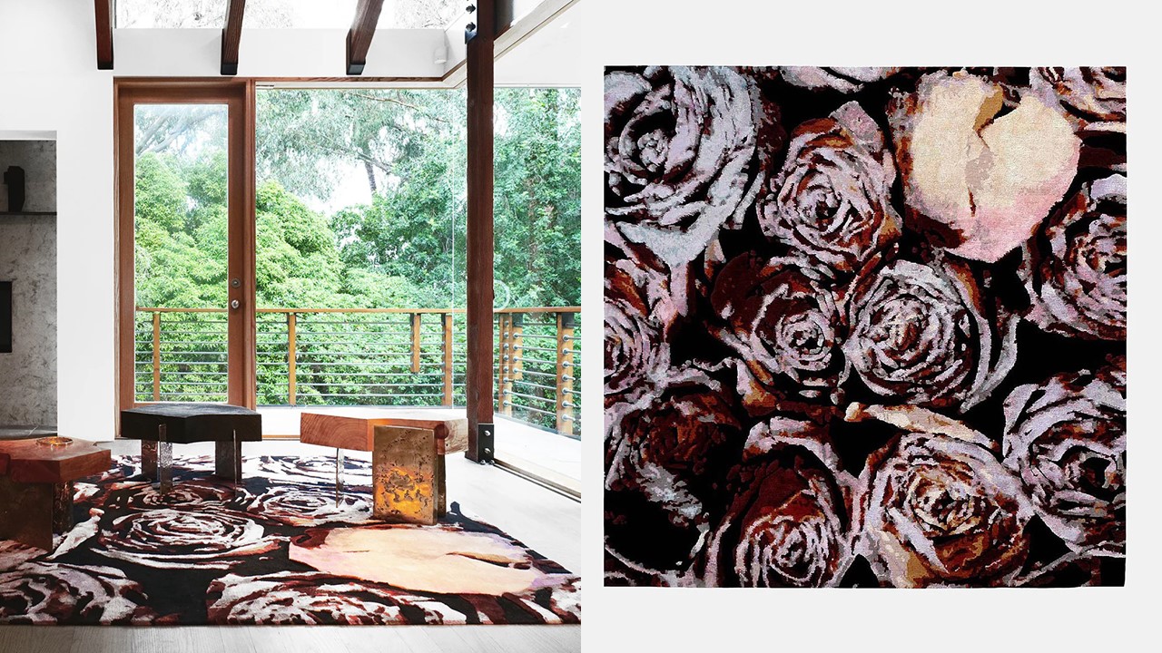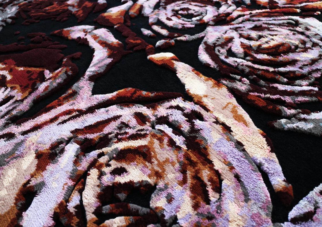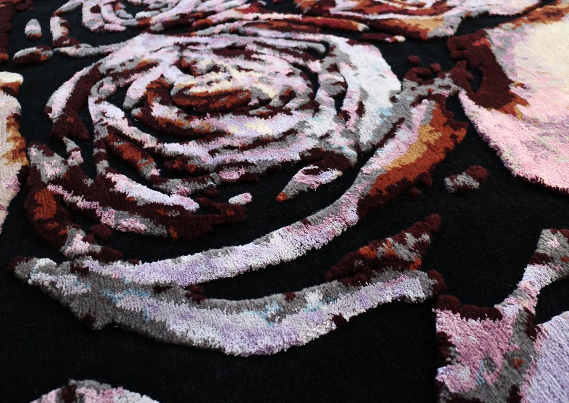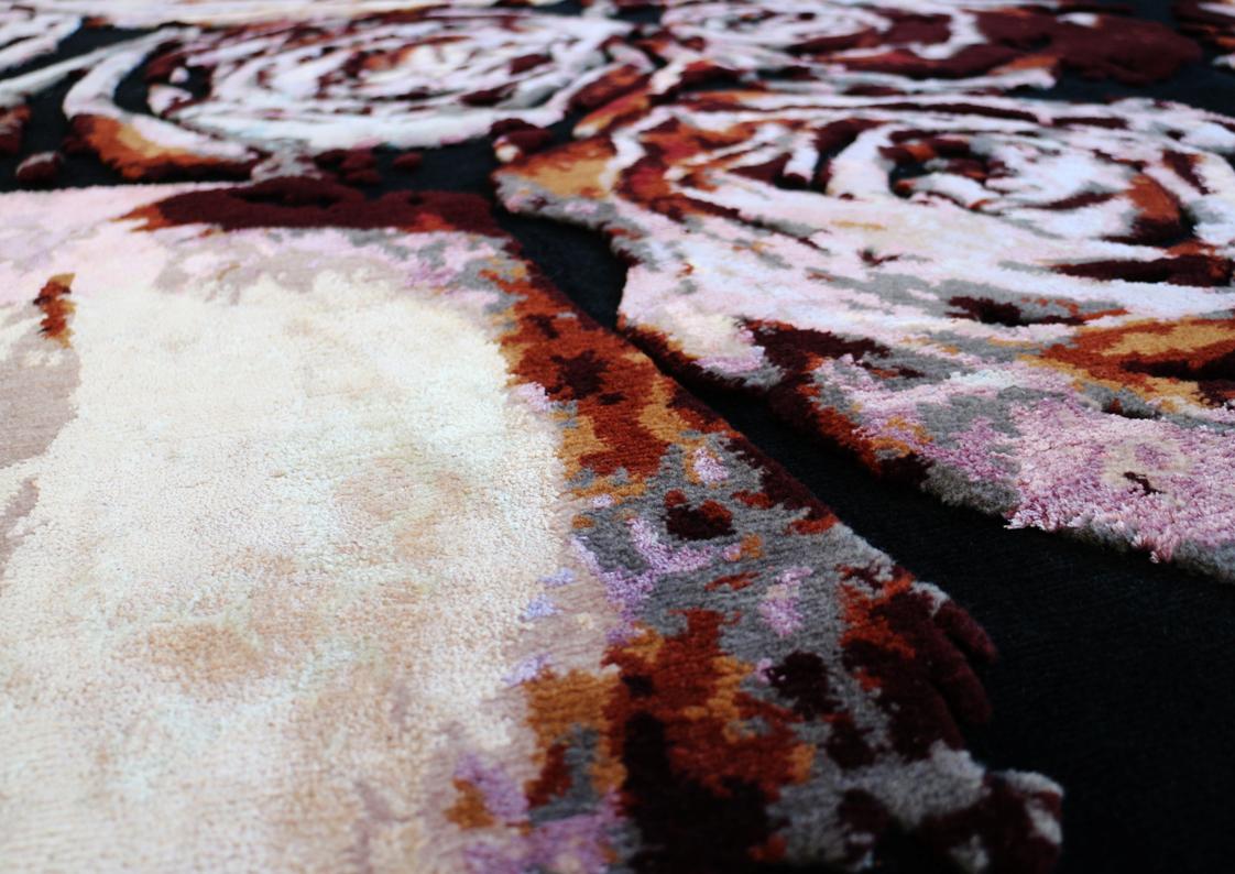NAN GOLDIN Wine and Roses 2014 – Nan Goldin is one of the most influential photographers of her generation, known for her intimate and unfiltered documentation of American and European subcultures. Living between New York and Paris, Goldin brings the same emotional intensity to her collaboration with Henzel Studio. For this limited-edition rug, Goldin reinterprets her photograph of dried roses—applying varied pile heights to mimic the texture and decay of the original image. As she explains, “The flowers aren’t dead to me; just transformed.” Goldin’s work has been exhibited at premier institutions including the Whitney Museum of American Art, the Palace of Versailles, Centre Pompidou, and Reina Sofía, solidifying her legacy as a groundbreaking visual storyteller.