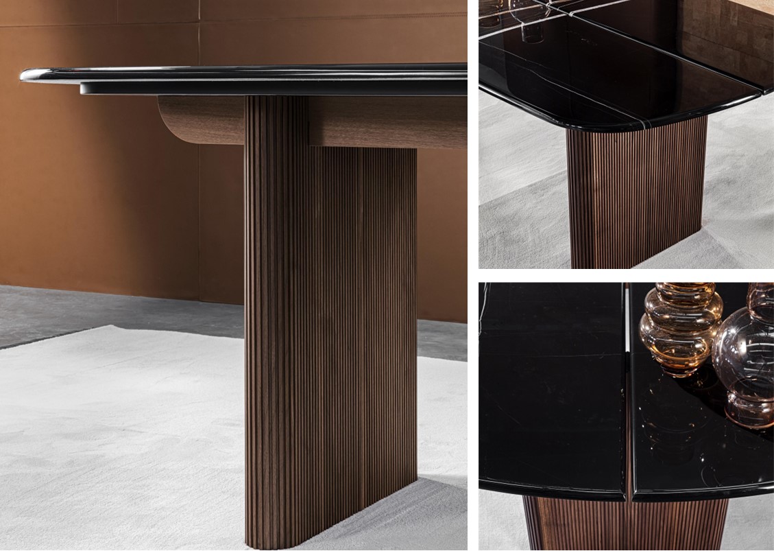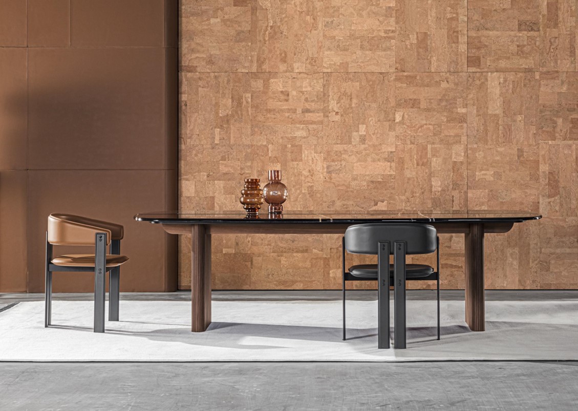 The Nimis table has two straight wooden legs, visually lightened by a vertically striped coating, while the marble top features a lengthwise division. A highly refined and dynamic play of detail and lines.