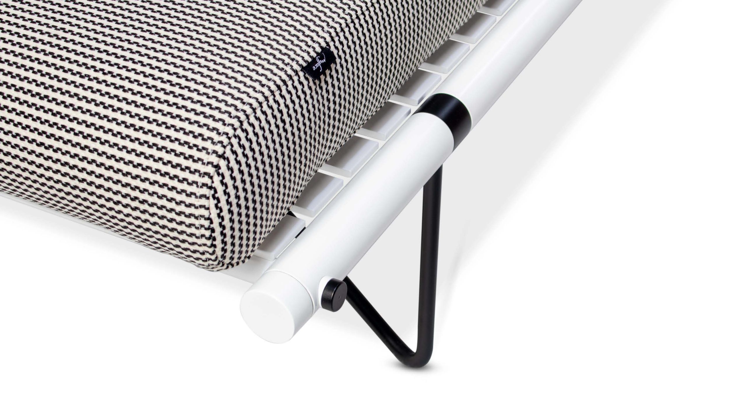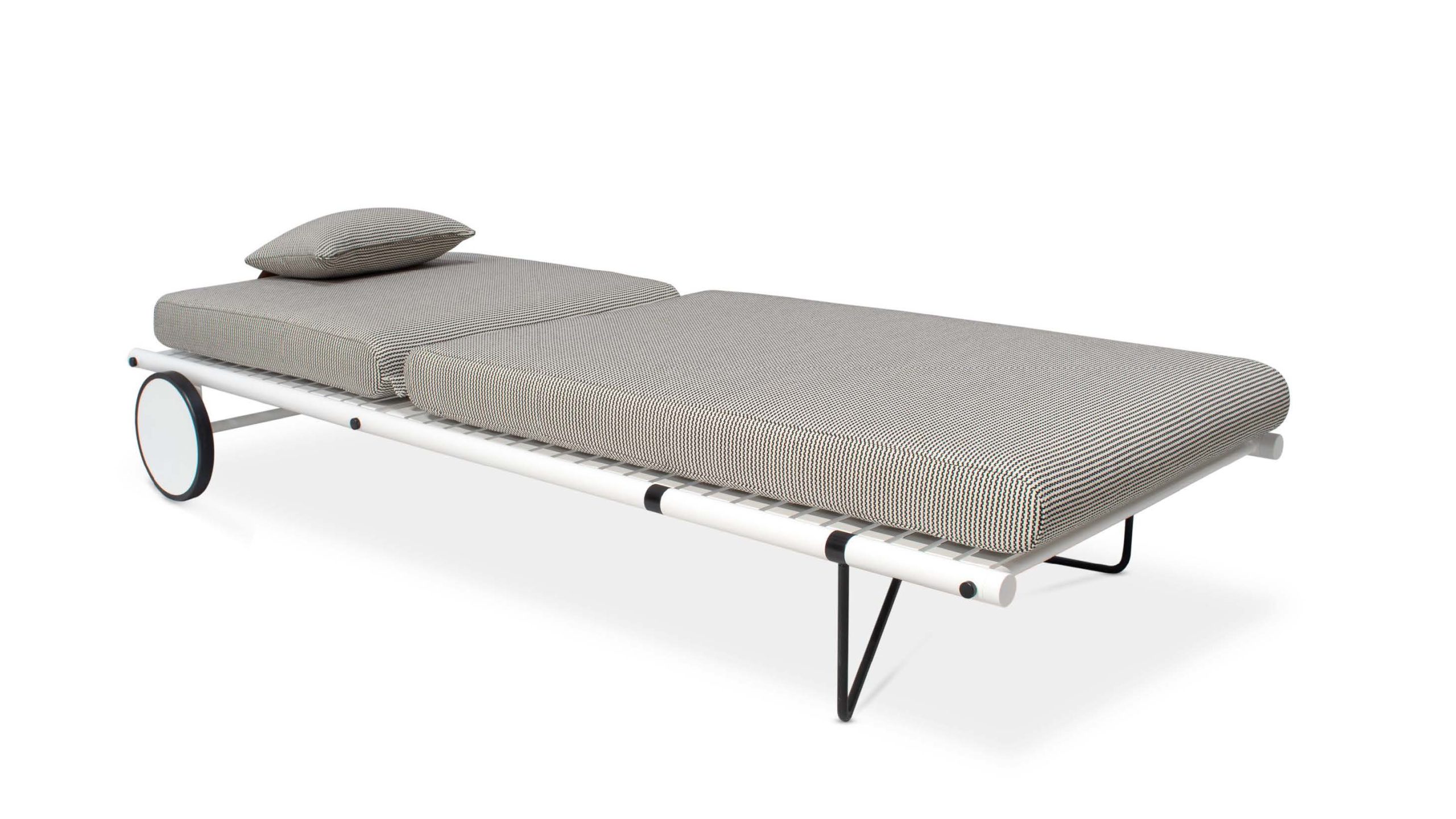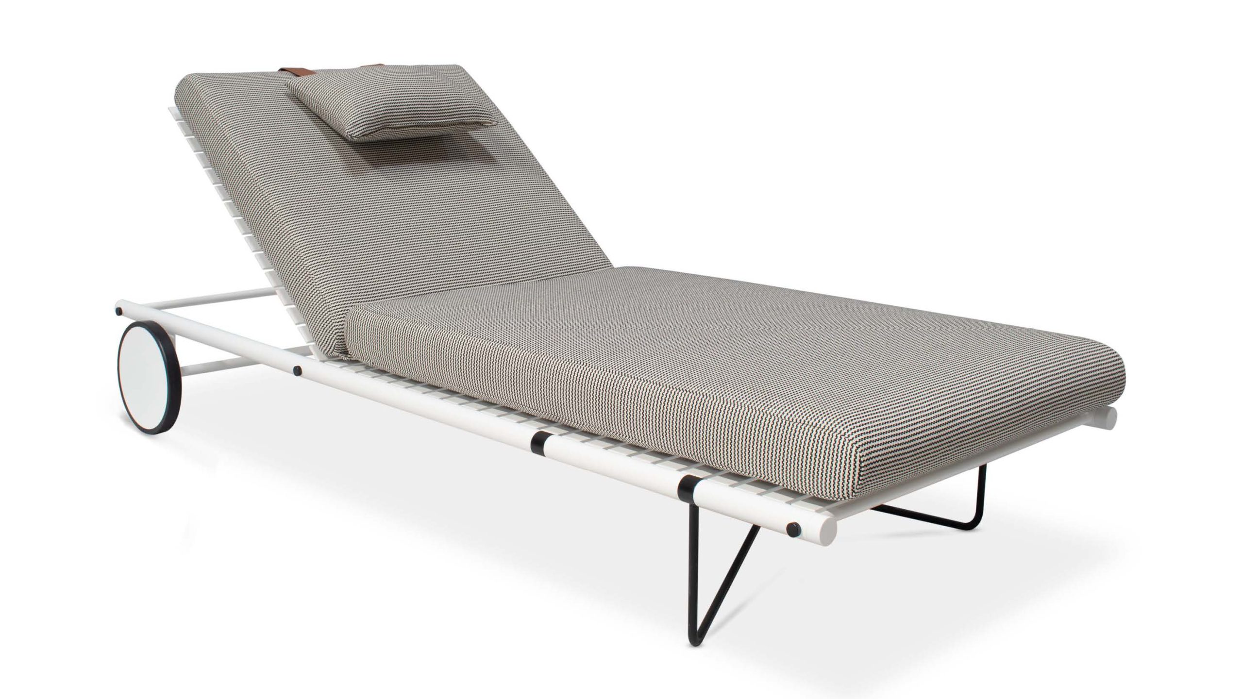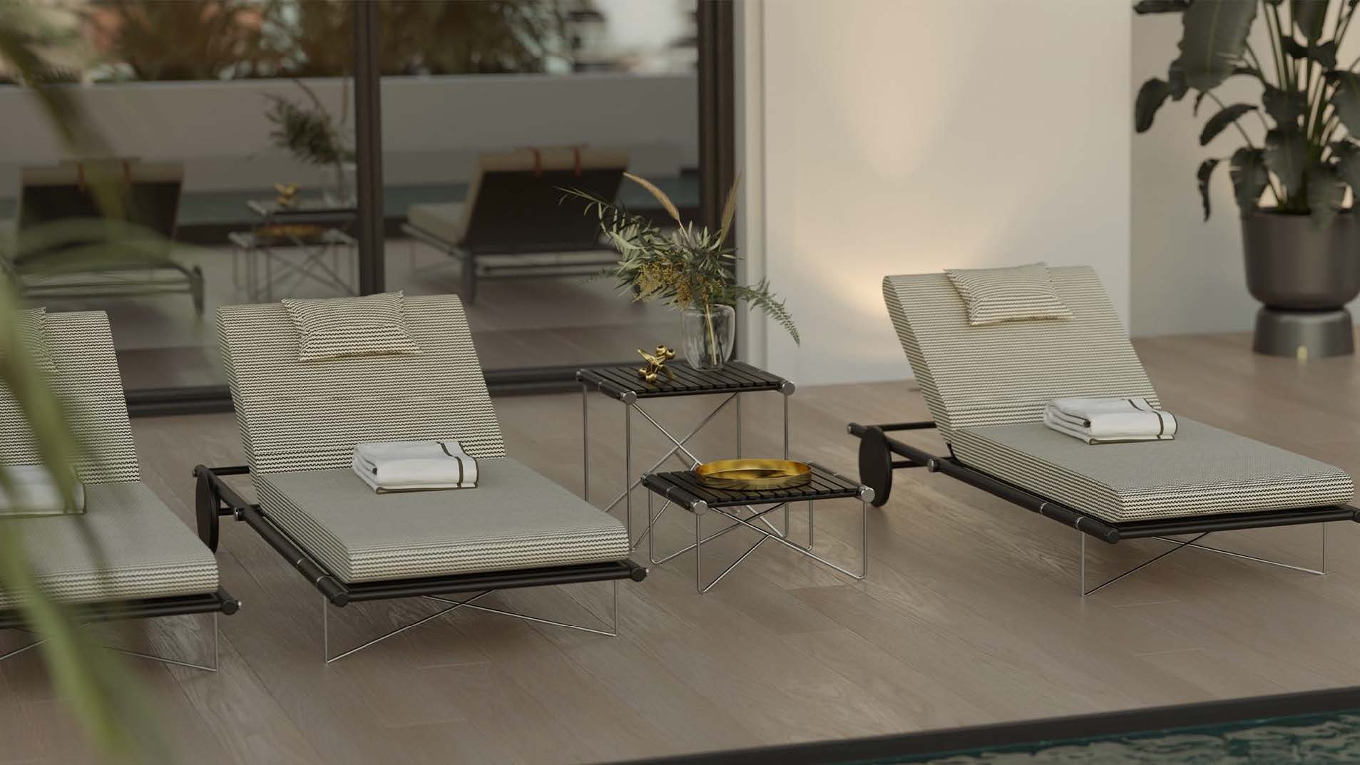 materials: lacquer + plated stainless steel, outdoor fabrics + quick dry foam
