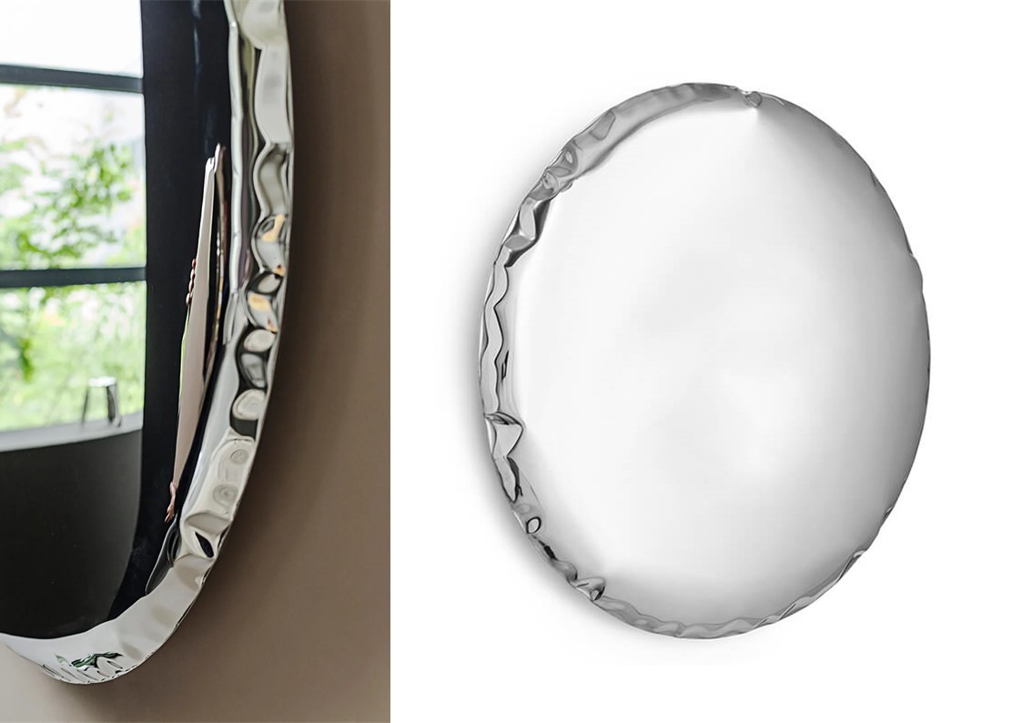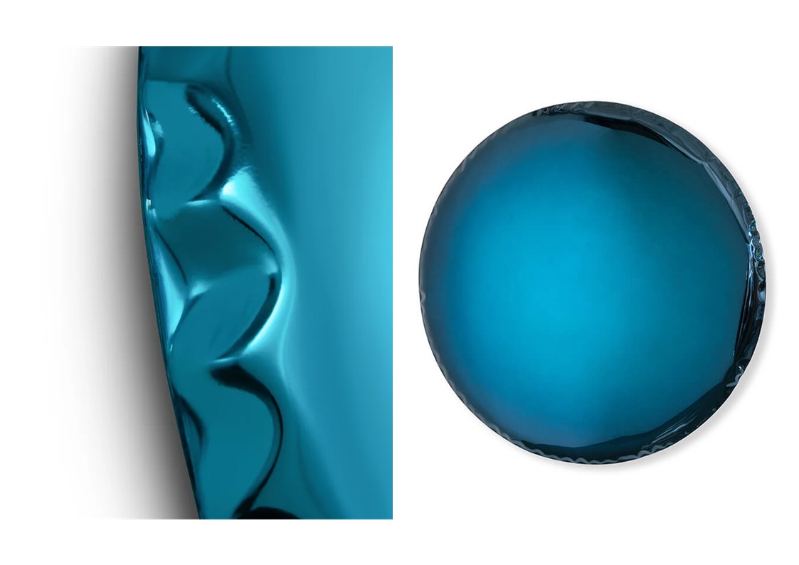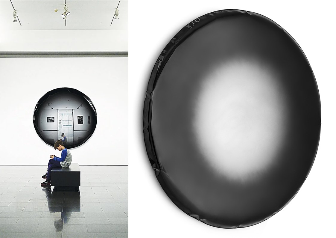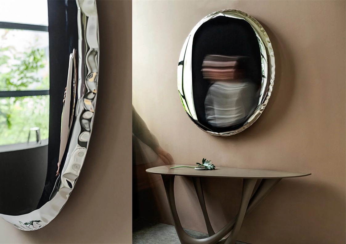 OKO is something more than just a mirror. Its ideally round, lustrous surface delicately reflects and diffuses light interacting with other objects and creating artistic effects in the interior. Made of stainless polished steel, its smooth but creased surface diffuses the surrounding reality and reveals psycho-perceptual phenomena of the material. OKO is a world of expressive deformations from another side of a sphere: uneasy, but also romantic in a way. Available in several sizes, as well as in a wide range of finishes – silver, black, red, gradient, emerald, deep space blue and sapphire-green shades. Limited custom options may be available (please inquire).