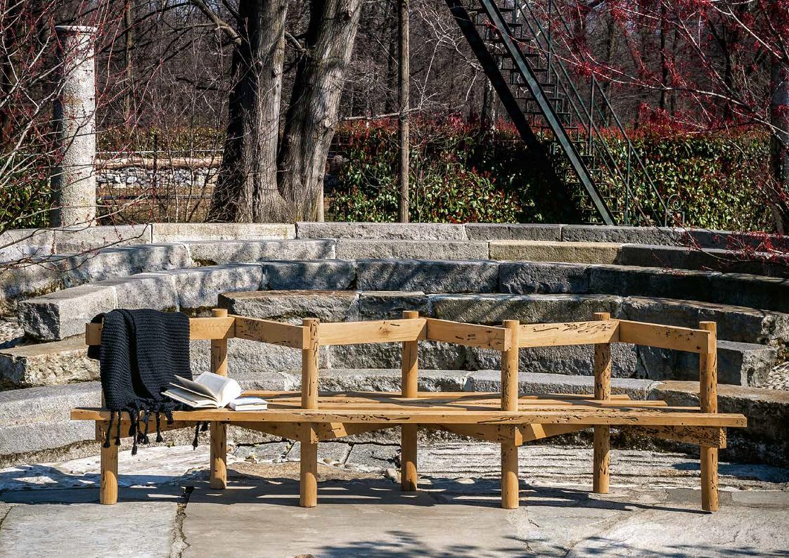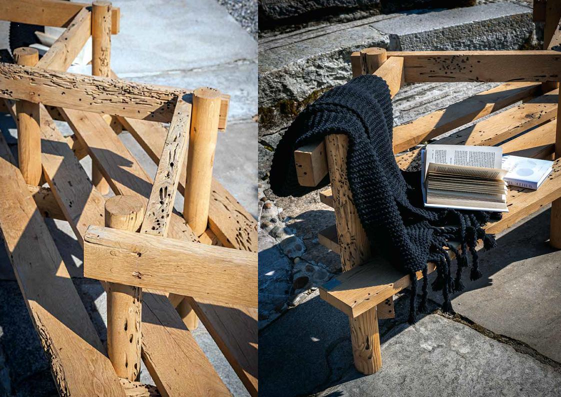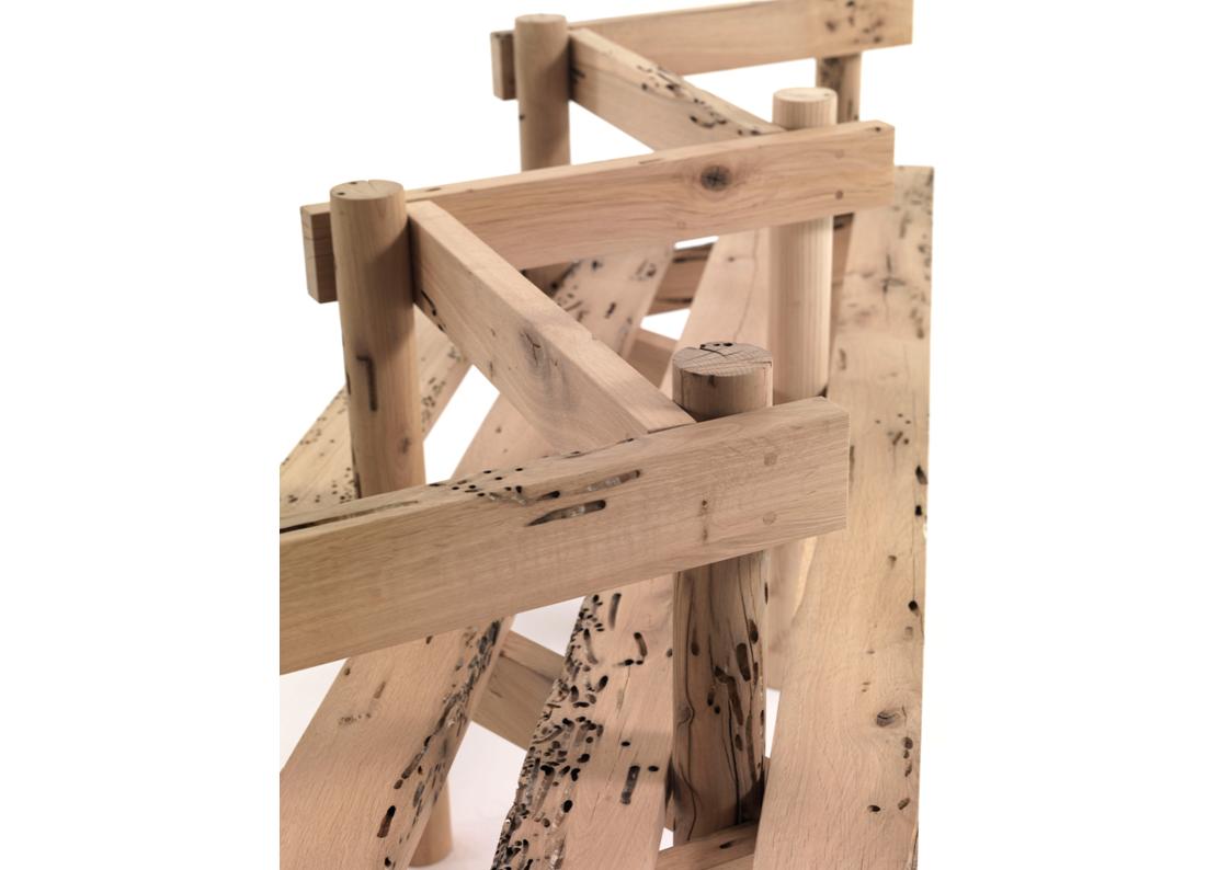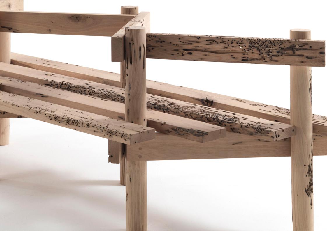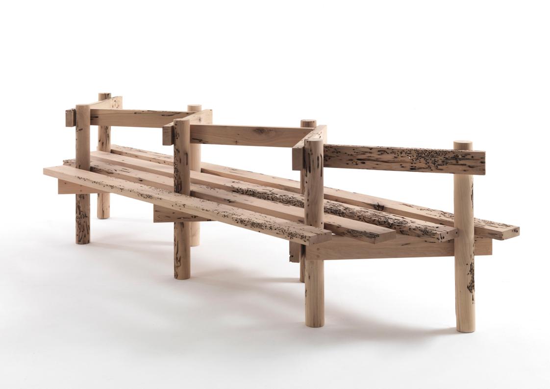 The Palizzata bench, part of the Briccole Limited Series is designed by world renowned architect Michele De Lucchi. His reputation for  radical and experimental architecture is notably demonstrated in the controlled chaos of this piece. Constructed of solid Briccole wood piles from the lagoon of Venice the reinterpretation of the classic slatted bench can accommodate 5 people. The distinguished zig-zag back and diagonal lines add dimension + character as well as a unique dual sitting experience.