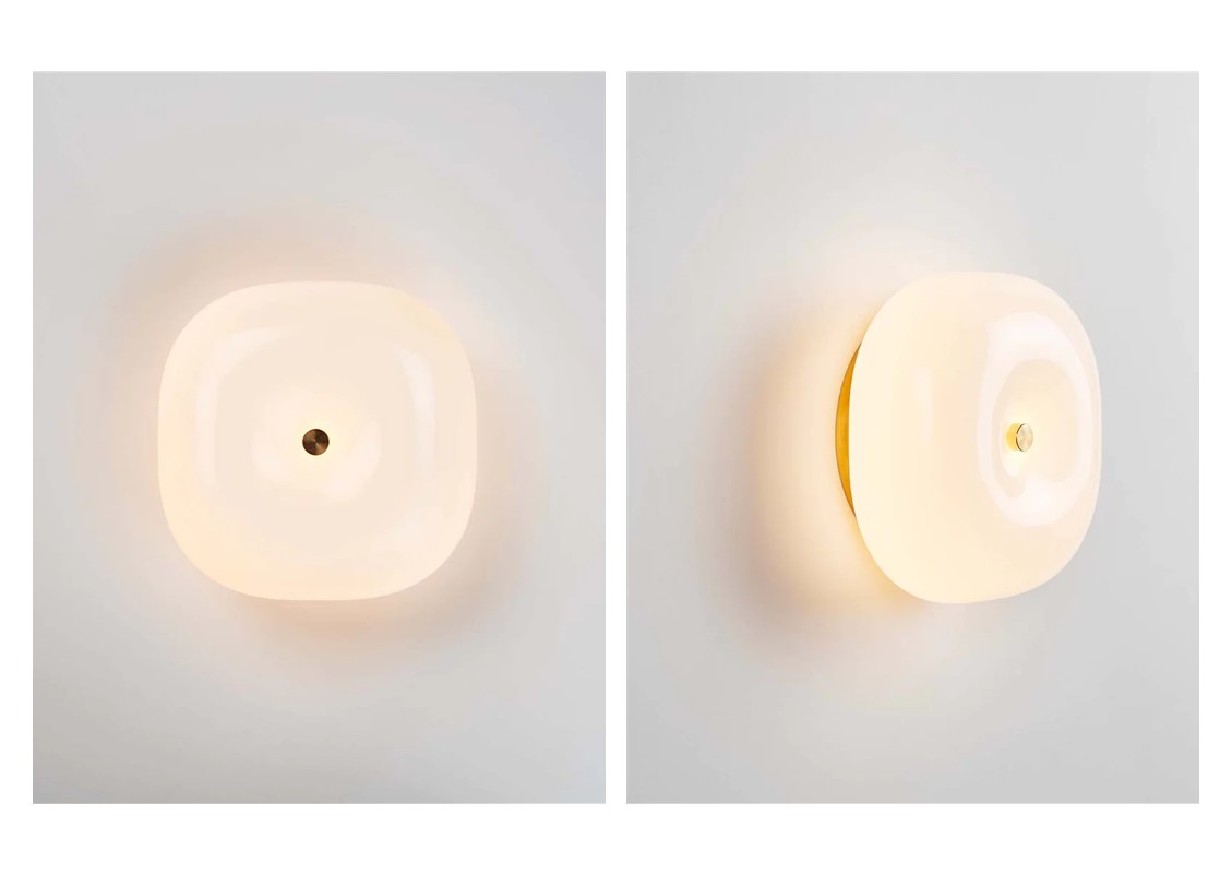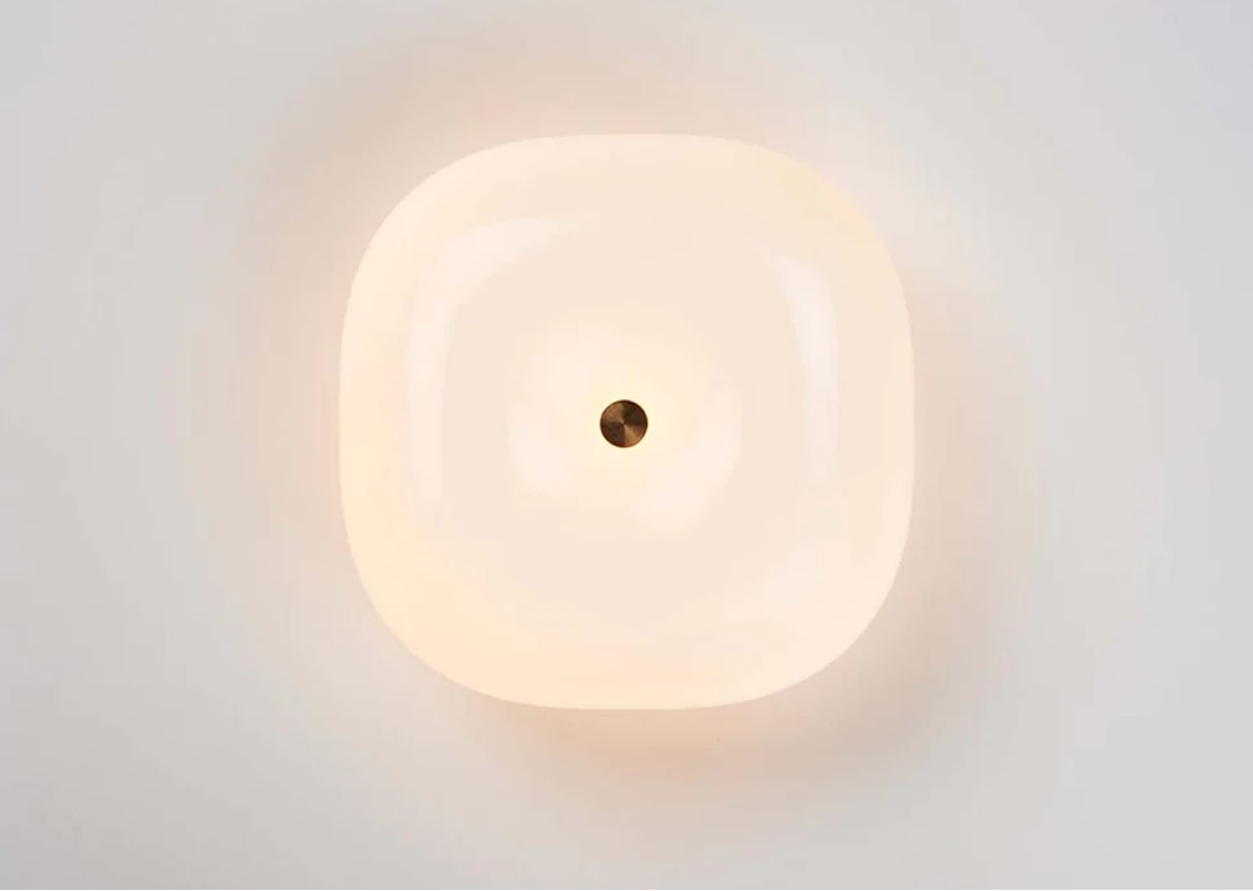 Soft and subtle like an expertly tailored cushion, Pillow will add warmth to any wall or ceiling. Made from hand-blown Italian glass and solid brass, Pillow is offered in two variations: round and square, and two finishes: unlacquered brass or polished nickel. Pillow is engineered and certified for use indoors + outdoors.