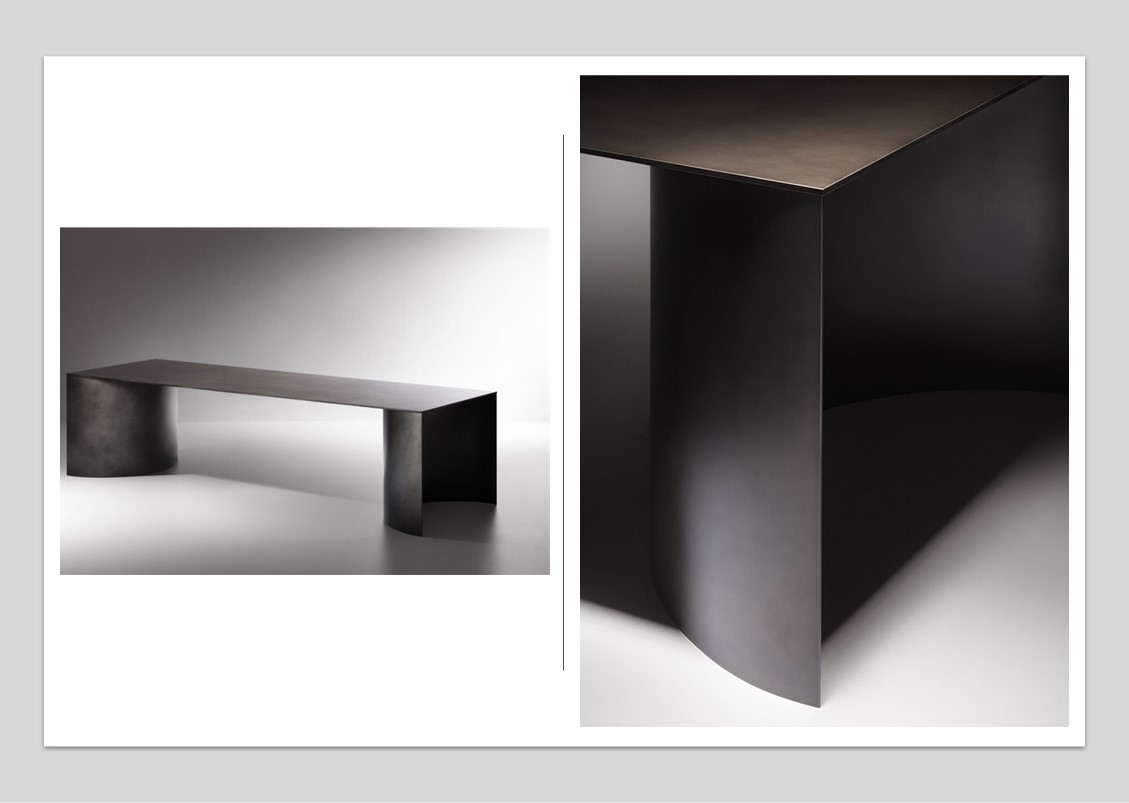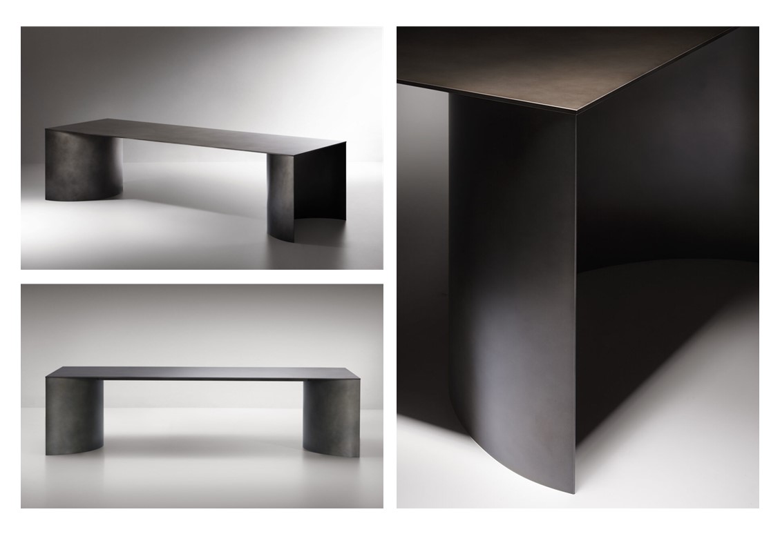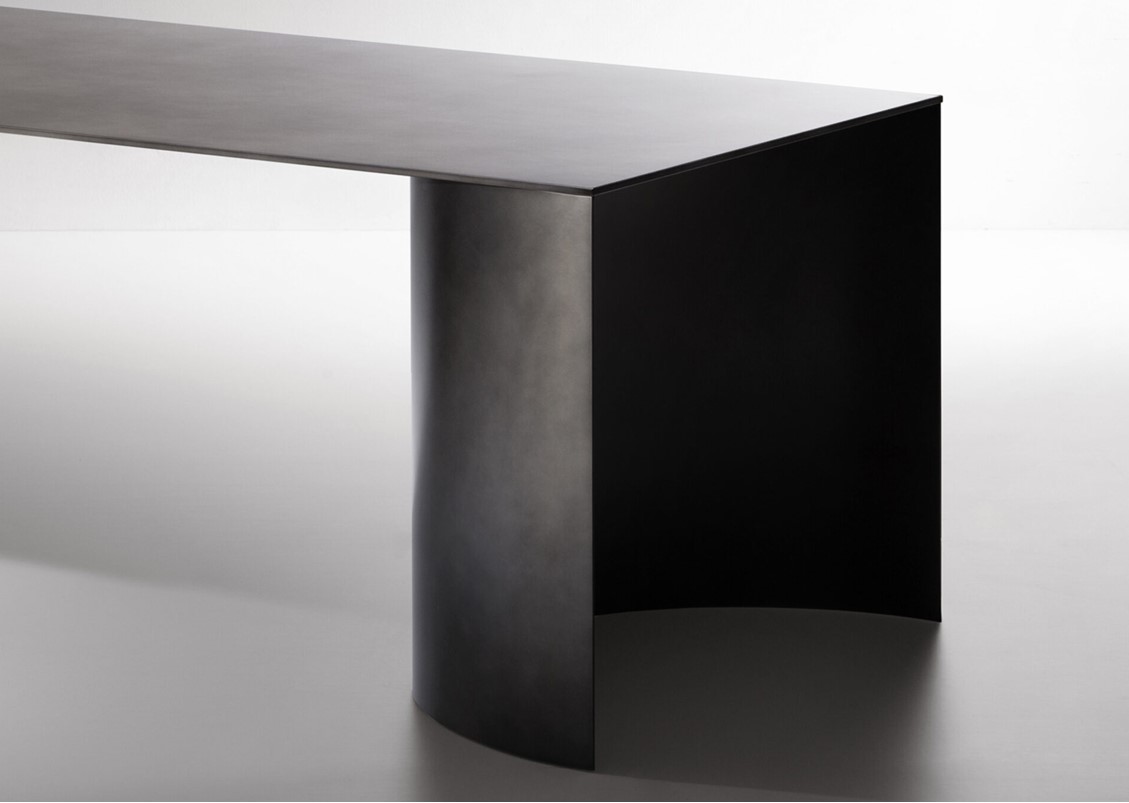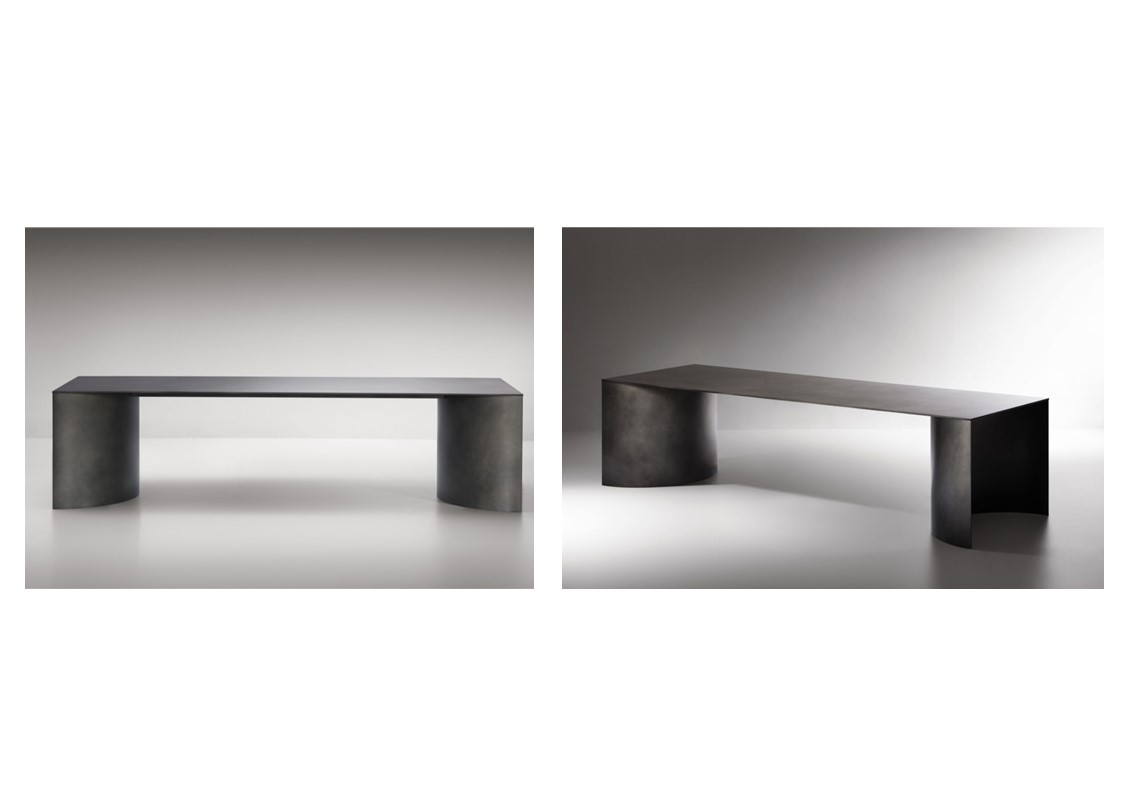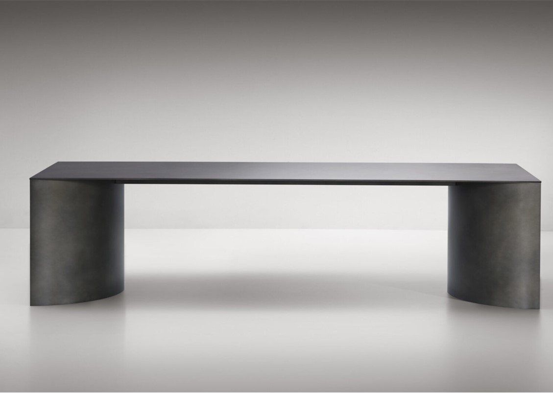 A sculptural presence and essential minimalism are the identifying characteristics of this table, made of just three elements: a thick rectangular top that rests on two large concave semi-cylinders, creating a pedestal. The pure, monolithic lines are initially determined by functionality and technique, then by aesthetics, to create a shape that is the maximum expression of the rigour and understatement of proportional harmony. Aluminum top with protective film – deLabre stainless steel bases