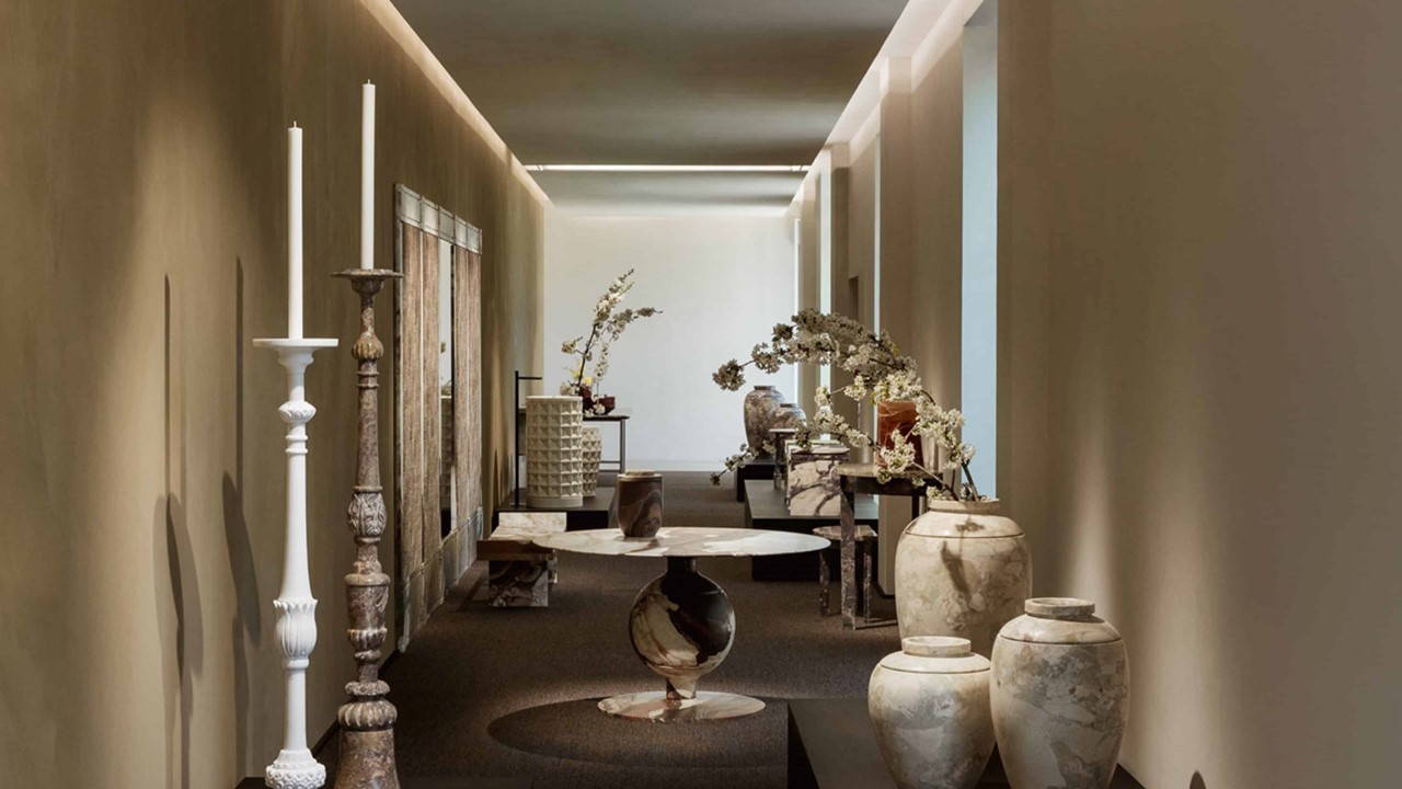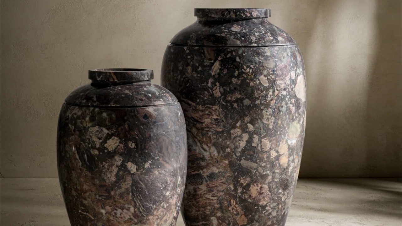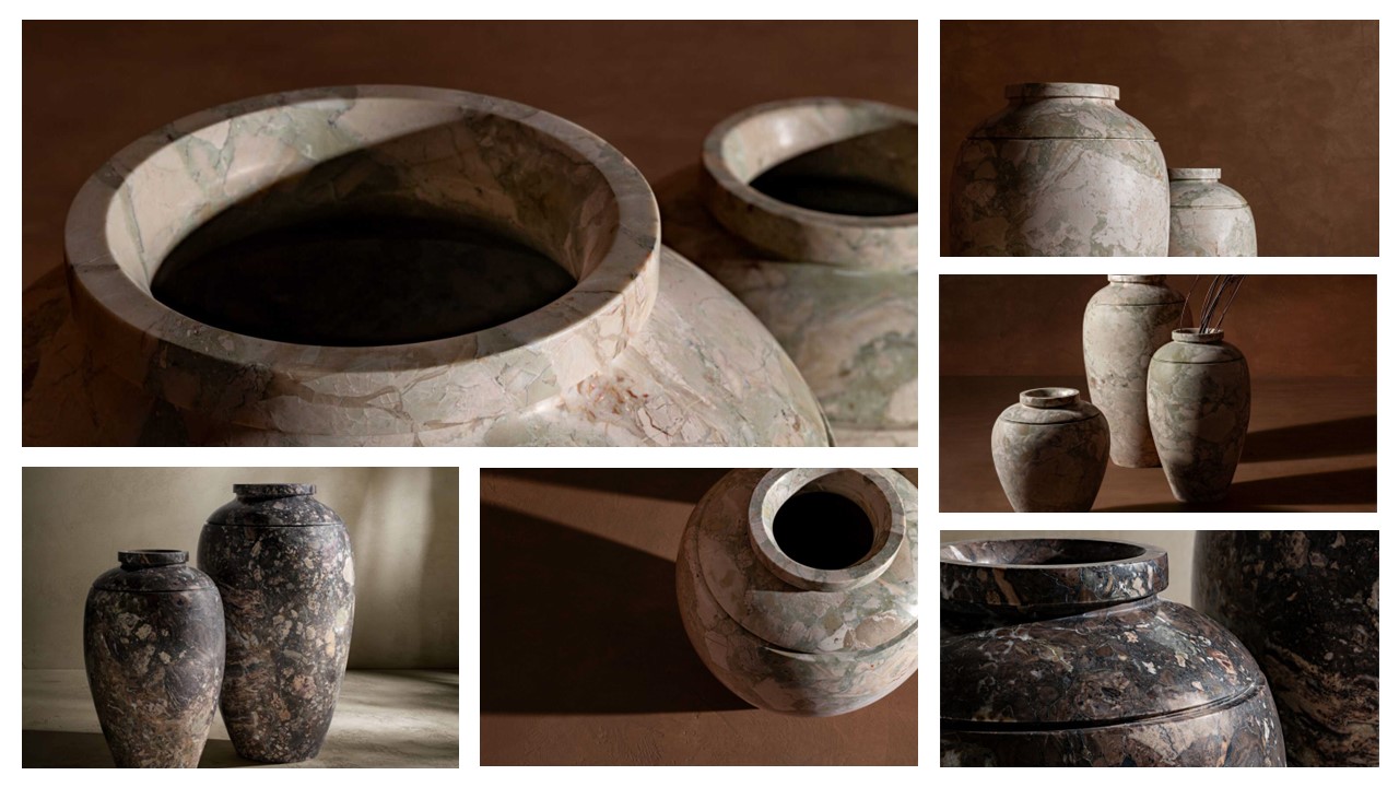 Three vases of different sizes make up the Precious collection. Carved from solid marble blocks, they are furrowed by a thin milling in the upper part of the product. This ornamental, still light detail enriches the soft, sinuous profile and alludes to a covering element, with a circular upper hole. These elegant amphorae, without handles, are suitable for both interior  + outdoor spaces, where the deep stone mottling blends with the colours of earth and nature.