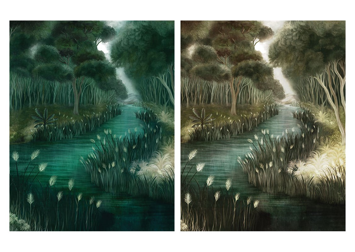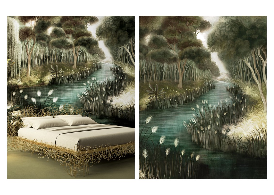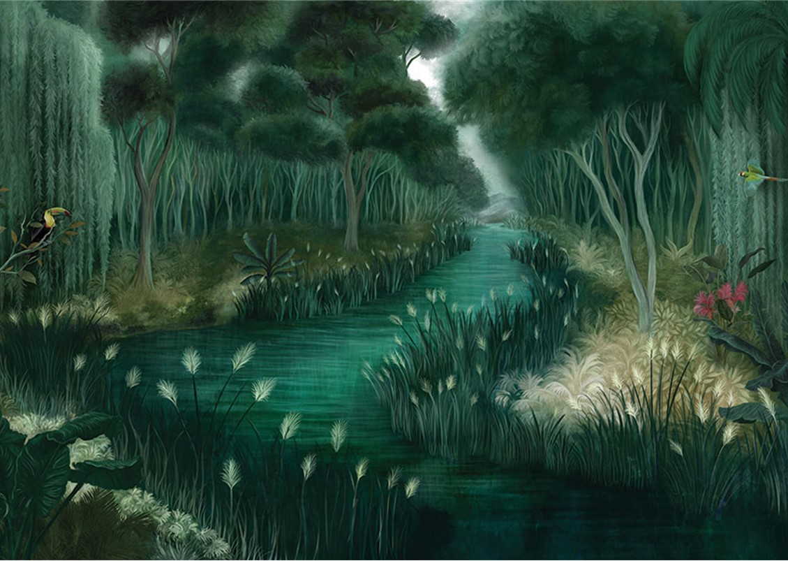 Rain Forest is inspired by a rainforest in South West of Romania. This tranquil setting depicts a protected national park that lets you immerse yourself in the sensation of untouched, peaceful nature. Like a child’s vivid imagination, this graphic wallpaper creates a serene + pristine atmosphere. Contract grade, UV-resistant, scratch-resistant, washable, 100% anti-microbial (treated with biocide).