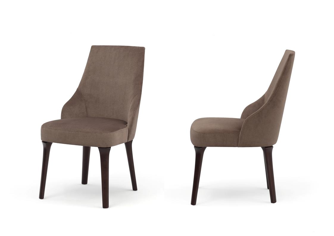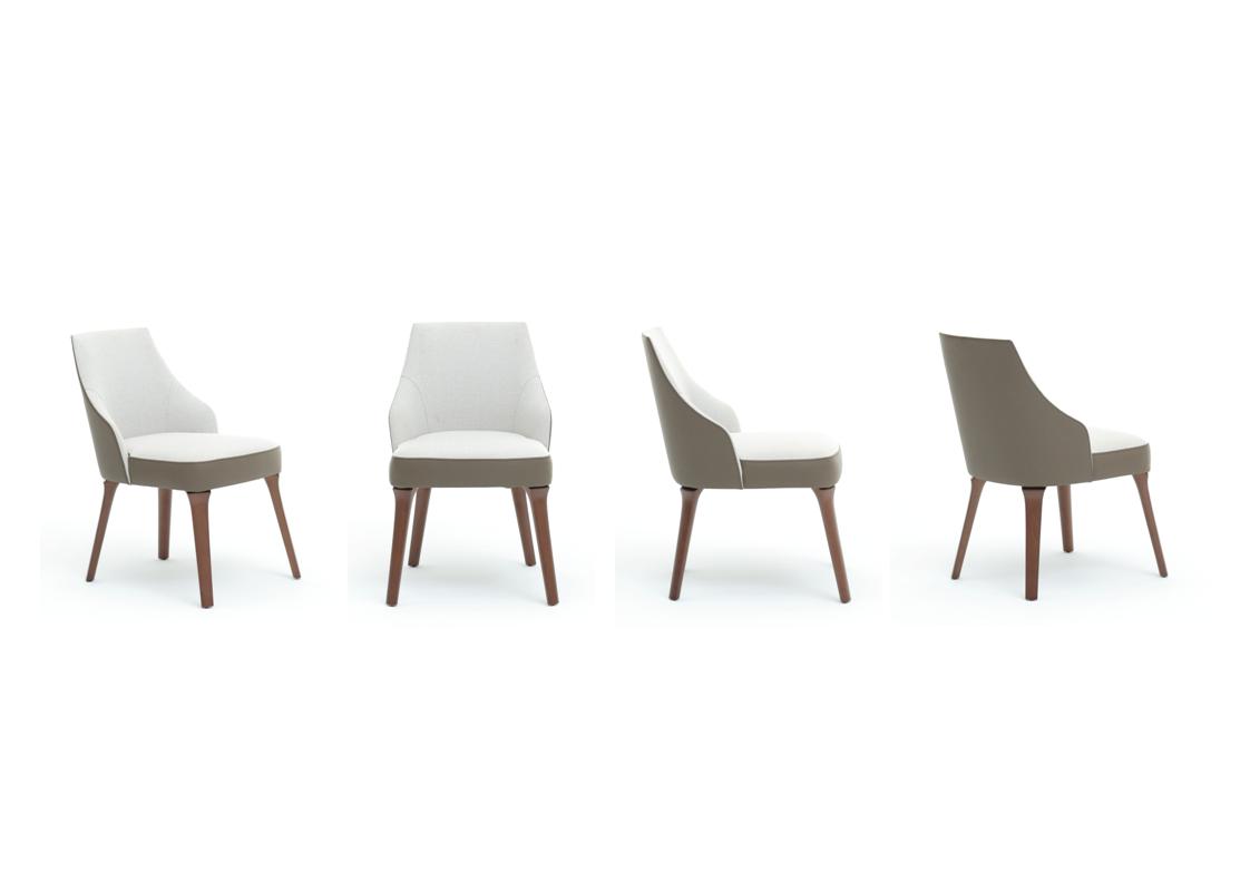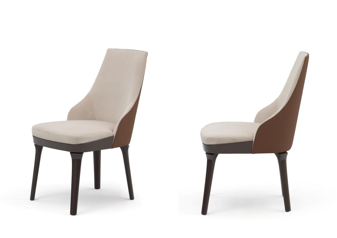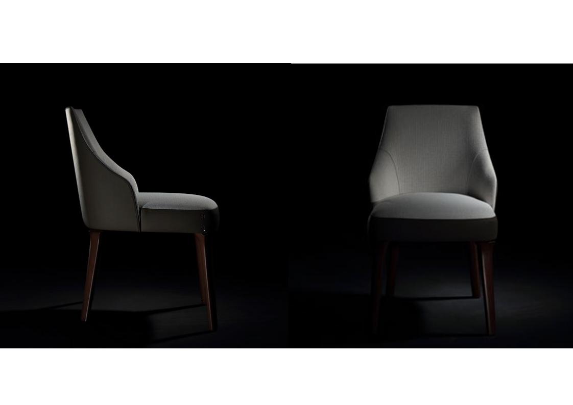 The Saletto dining chair, available in two different models, is distinguished by genteel shapes and winding contours that contrast with assertive lines. Between the two models of the Saletto chair, the customizable options are endless. Available with or without arms, with a visible seat base or a fully upholstered seat, and with solid walnut, solid oak stains, matte lacquer, gloss lacquer, or leather upholstered legs, the Saletto dining chair is incredibly versatile