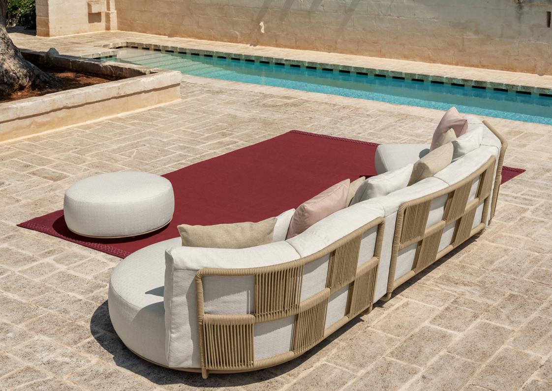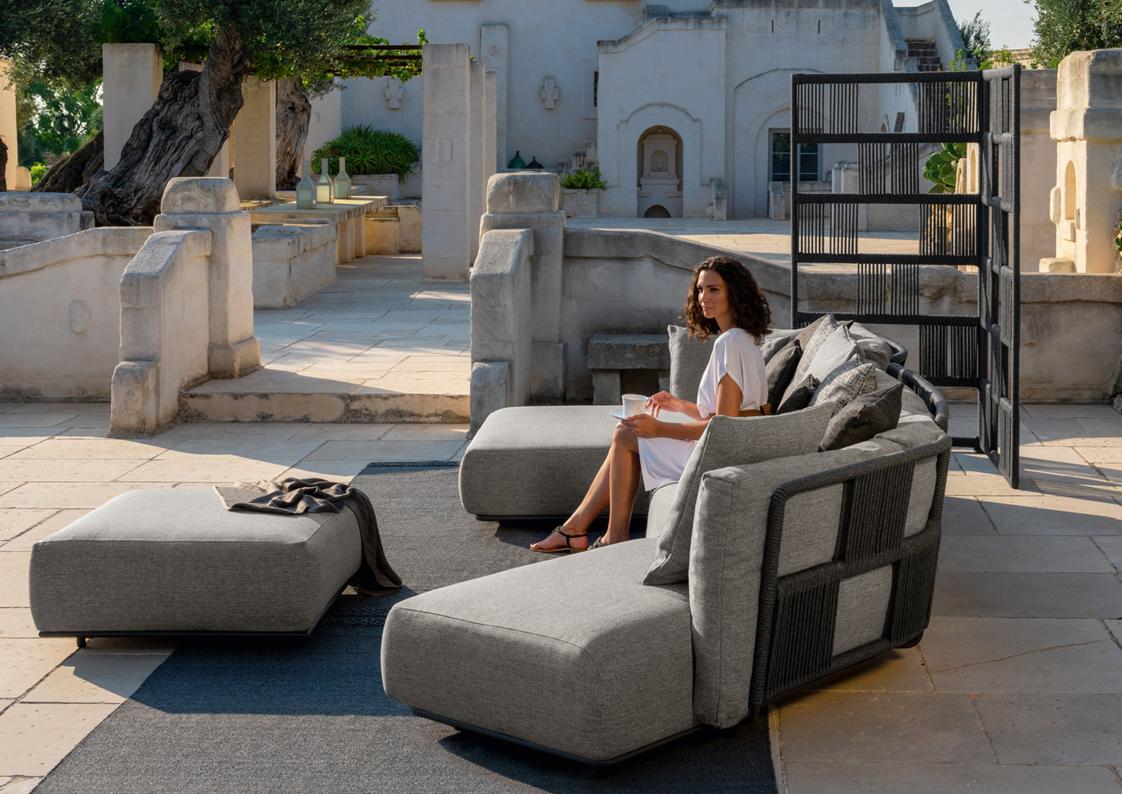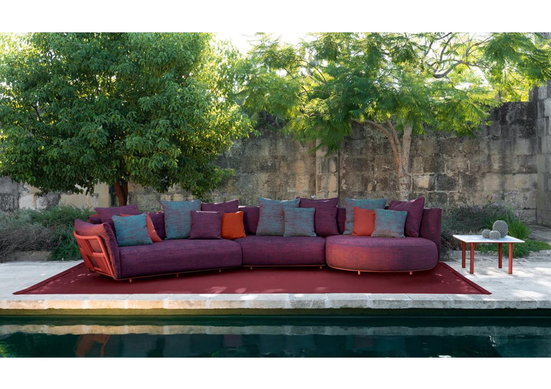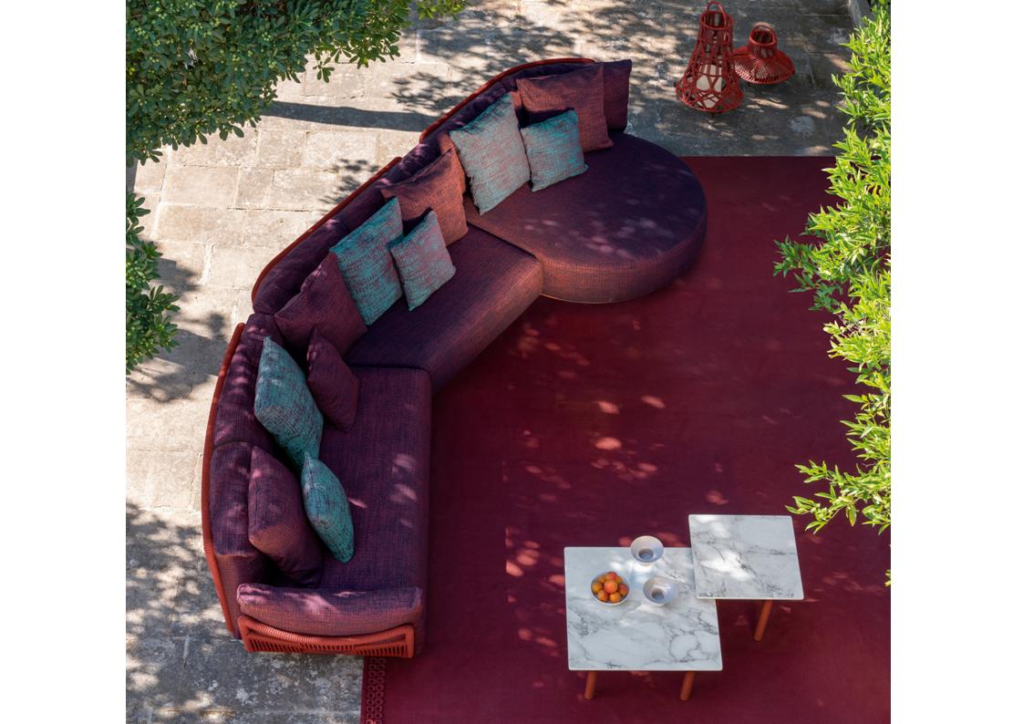 Scacco is a modular sofa designed to be versatile in all its applications. With soft, rounded shapes and an eclectic style, it is available in several modules. The structure of each module is made of aluminum, supporting the cushions, in quick dry foam, covered with fabric, resistant to atmospheric agents. In addition to the forms of the modules, the particularity of the product is noted in the backrest. Also made of aluminum, it is entirely wrapped in synthetic nautical ropes, whose intertwining creates a geometric design similar to the chess table. The presence of central modules makes it possible to optimize spaces, being able to create the modular sofa with a curvilinear structure.