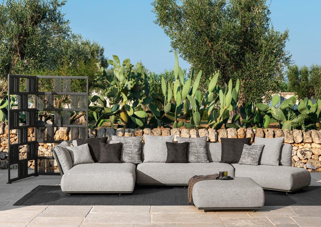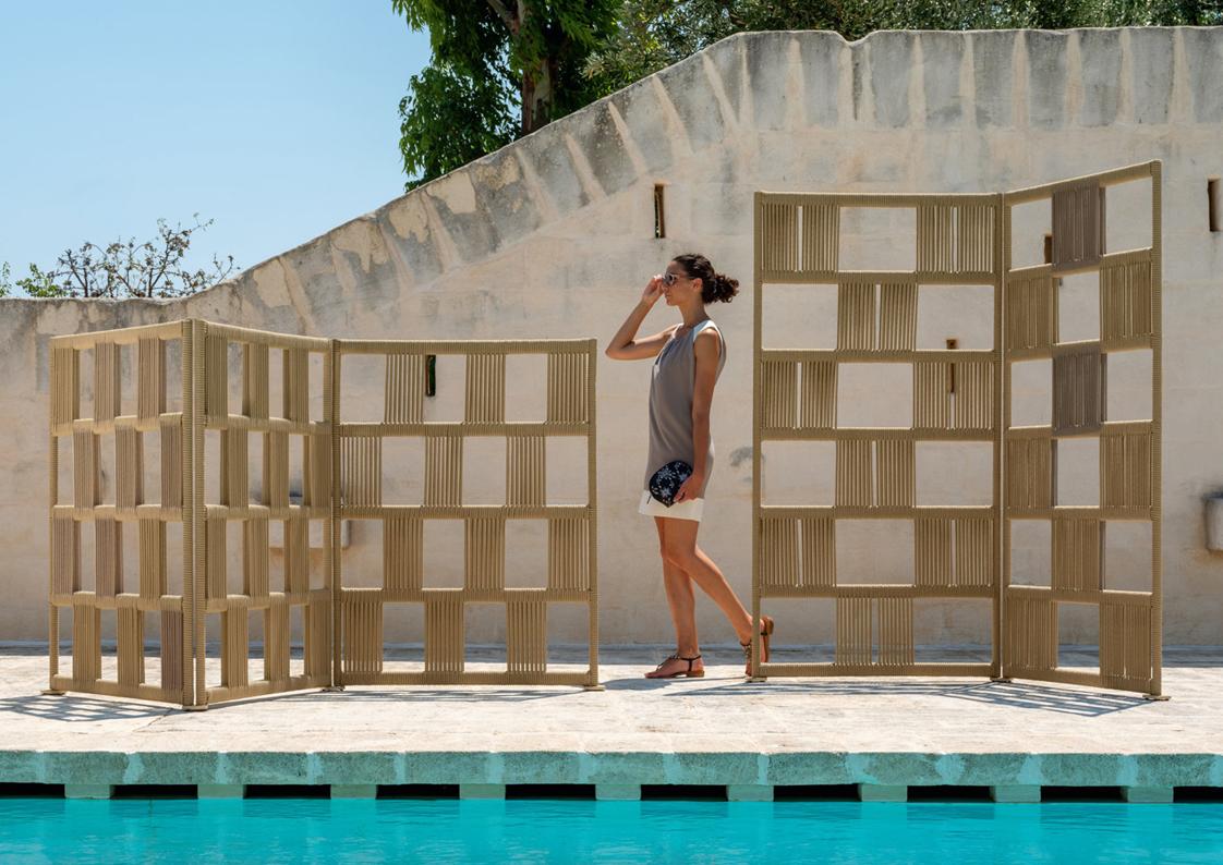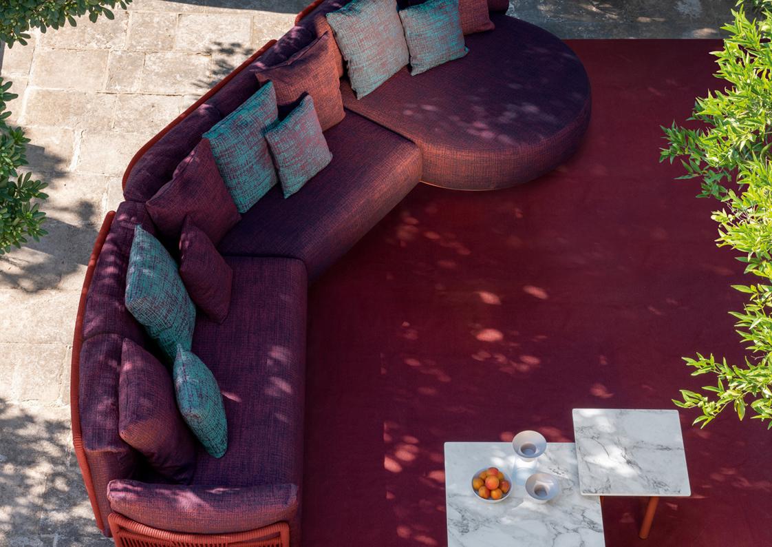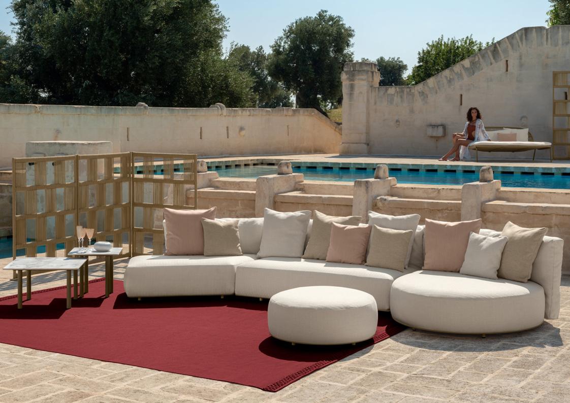 Scacco is a modular sofa designed to be versatile in all its applications. With soft, rounded shapes and an eclectic style, it is available in several modules. The structure of each module is made of aluminum, supporting the cushions, in quick dry foam, covered with fabric, resistant to atmospheric agents. In addition to the forms of the modules, the particularity of the product is noted in the backrest. Also made of aluminum, it is entirely wrapped in synthetic nautical ropes, whose intertwining creates a geometric design similar to the chess table. The presence of central modules makes it possible to optimize spaces, being able to create the modular sofa with a curvilinear structure.