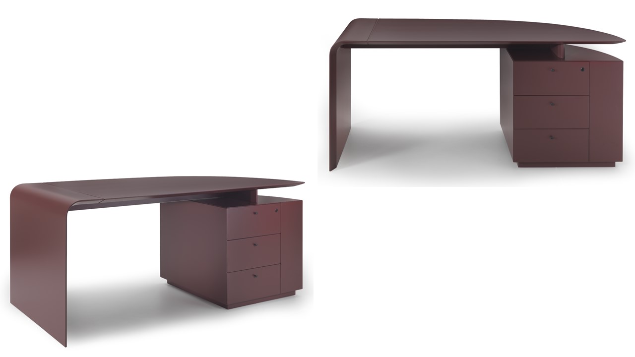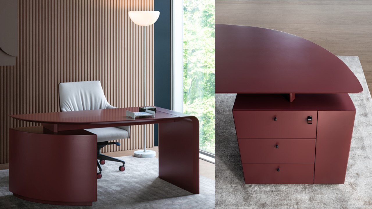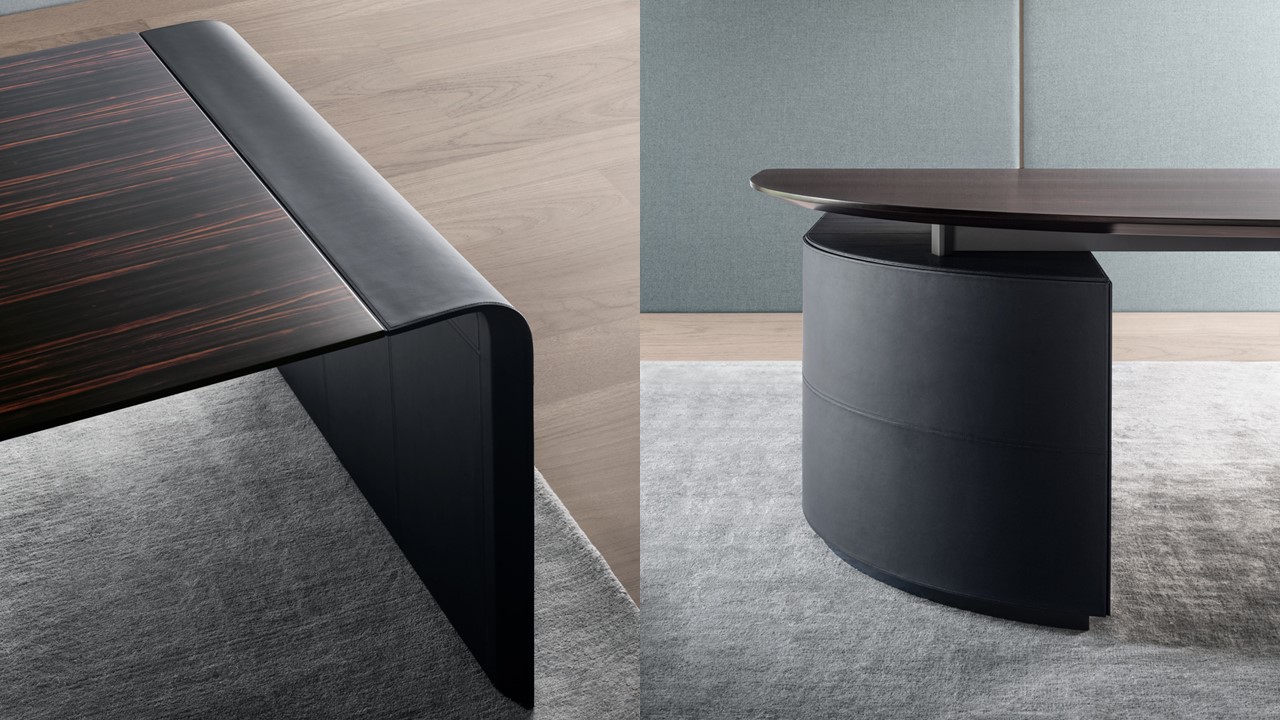 The Siena Executive Desk exemplifies Italian sophistication through precision geometry, refined materials, and architectural form. Designed by Ludovica + Roberto Palomba, its seamless surface bends gracefully to form its own structure on one side, balanced by a bold, sculptural volume on the other. Crafted in Italy from natural wood and saddle leather, the Siena combines minimalist design with artisanal richness. Its lacquered finish introduces a contemporary elegance to the executive workspace, while an alternate home-office version offers the same elevated craftsmanship in a more compact form. The result is a statement of quiet power—modern, functional, and impeccably detailed.