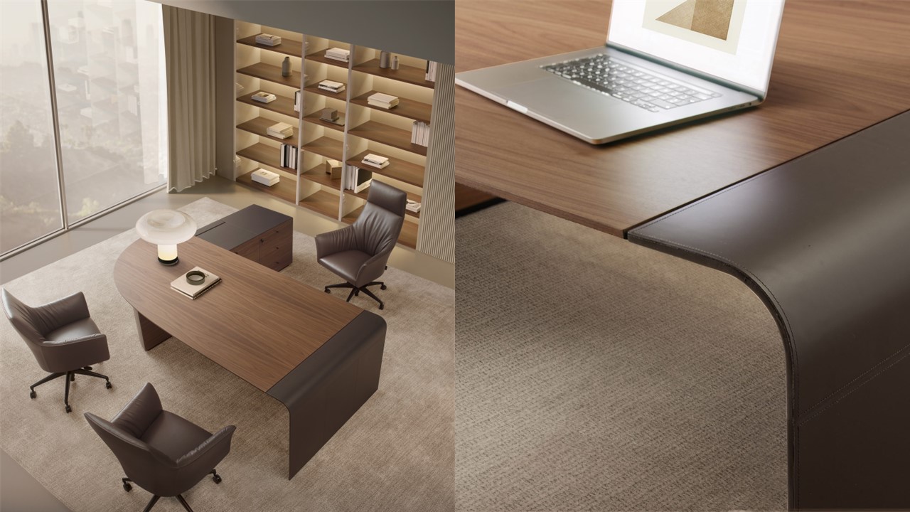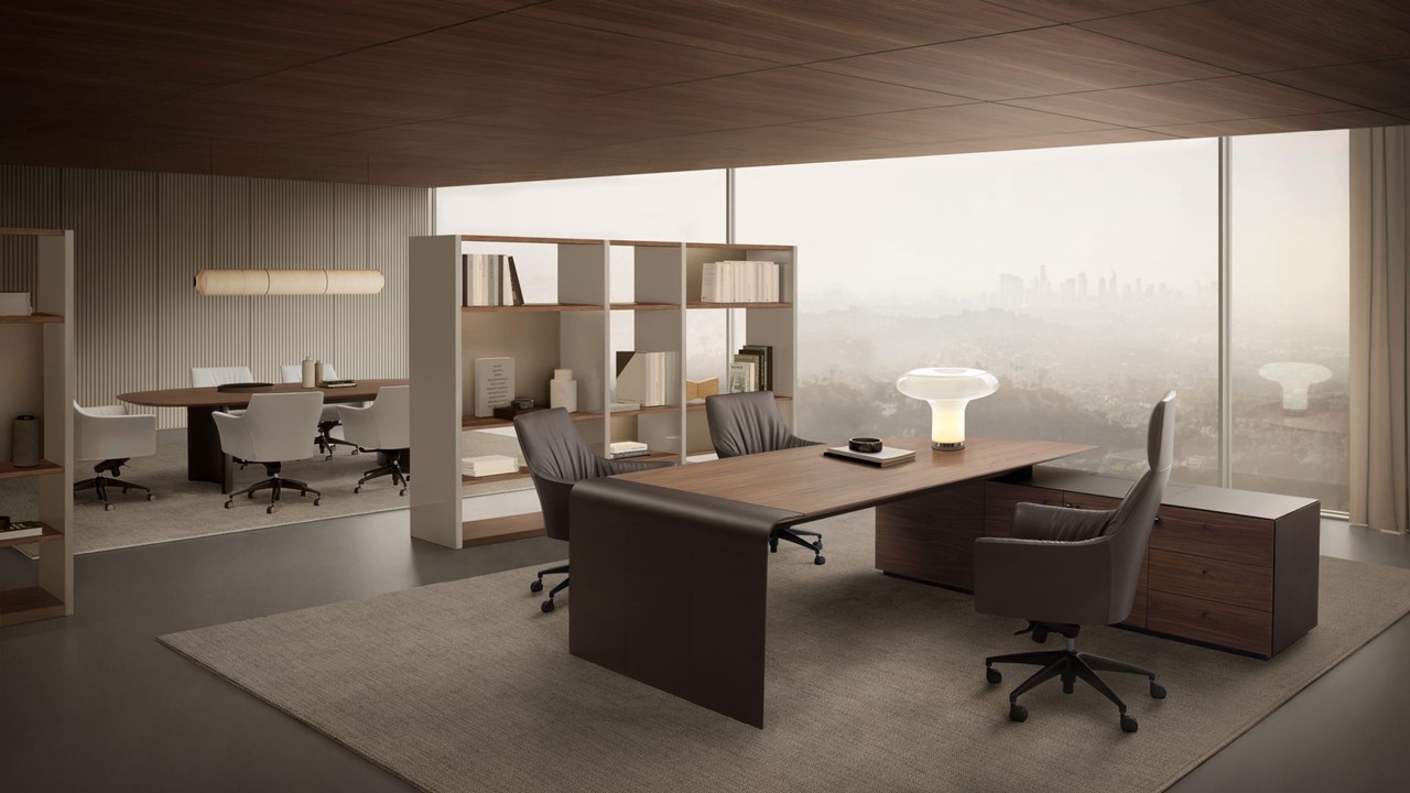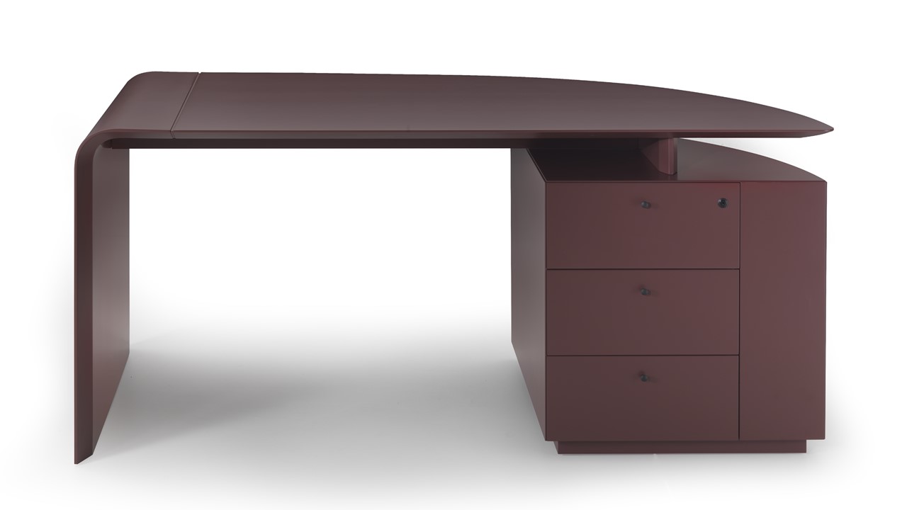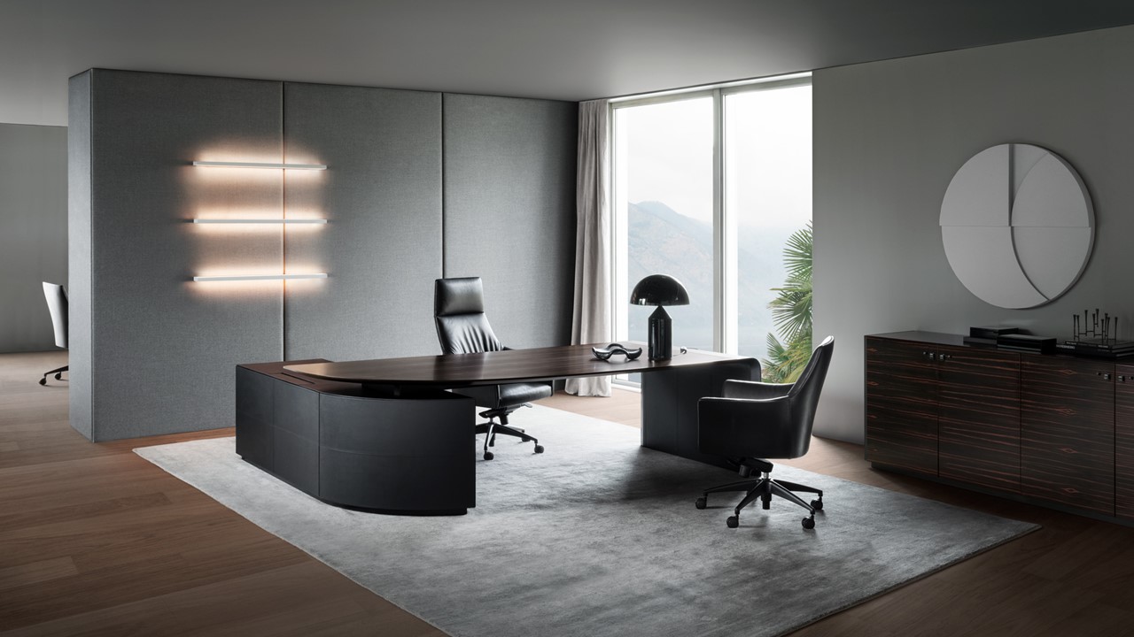 The Siena Executive Desk exemplifies Italian sophistication through precision geometry, refined materials, and architectural form. Designed by Ludovica + Roberto Palomba, its seamless surface bends gracefully to form its own structure on one side, balanced by a bold, sculptural volume on the other. Crafted in Italy from natural wood and saddle leather, the Siena combines minimalist design with artisanal richness. Its lacquered finish introduces a contemporary elegance to the executive workspace, while an alternate home-office version offers the same elevated craftsmanship in a more compact form. The result is a statement of quiet power—modern, functional, and impeccably detailed.