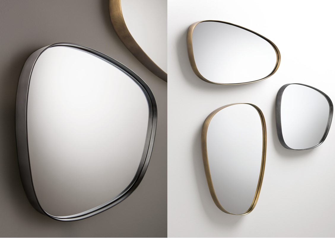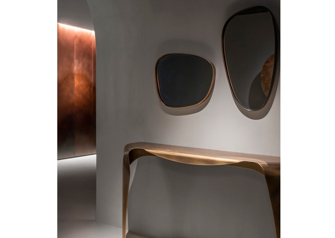 The Syro Mirror echoes the organic silhouettes of the entire Syro collection, translating them into mirrored surfaces that, surrounded by thick iron and brass frames, mimic the natural outlines of petals. In a mix of chromatic effects obtained from various metal treatments, these multifaceted shapes can be arranged as desired, on their own or in a grouping. The organic nature of the collection is thus amplified, revealing the multiple ways they can be combined on the wall, to surprisingly dramatic results.