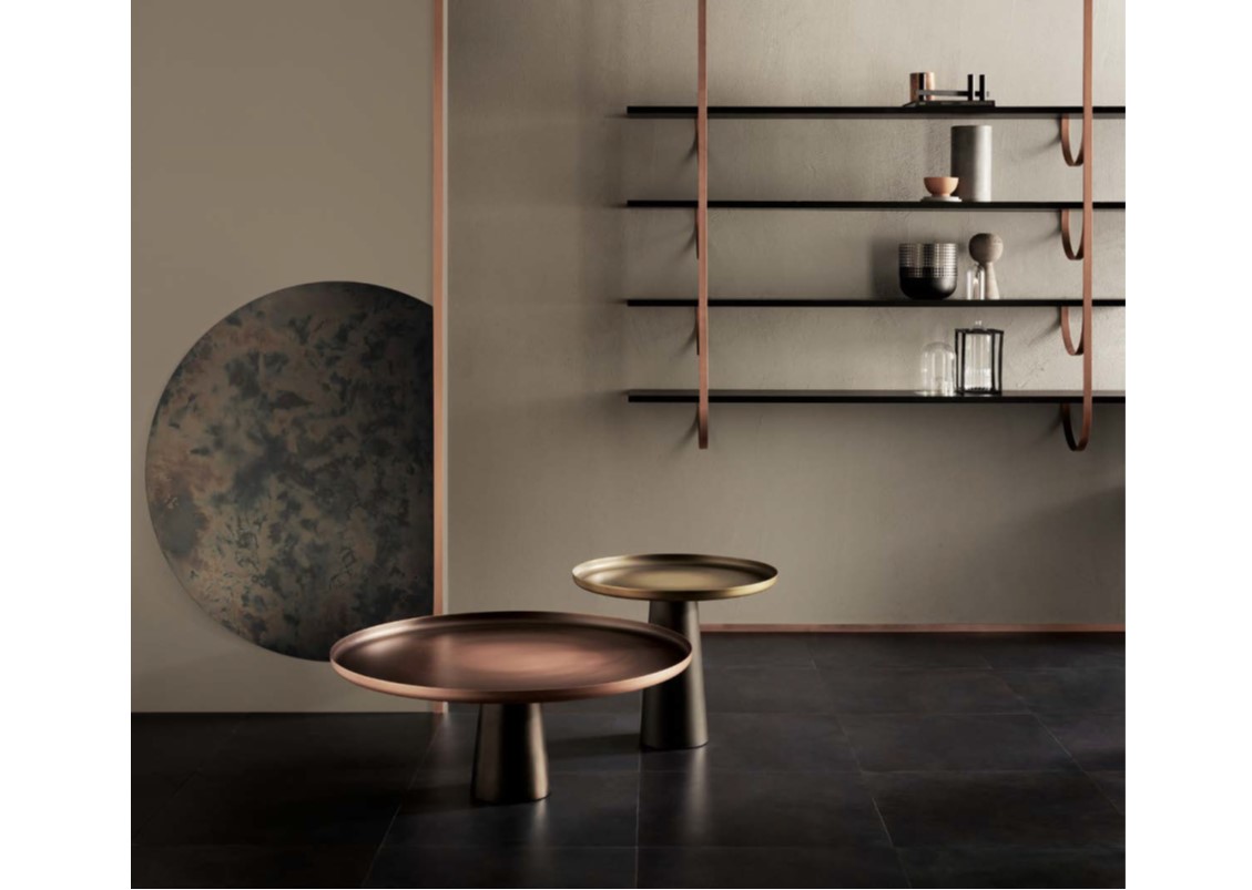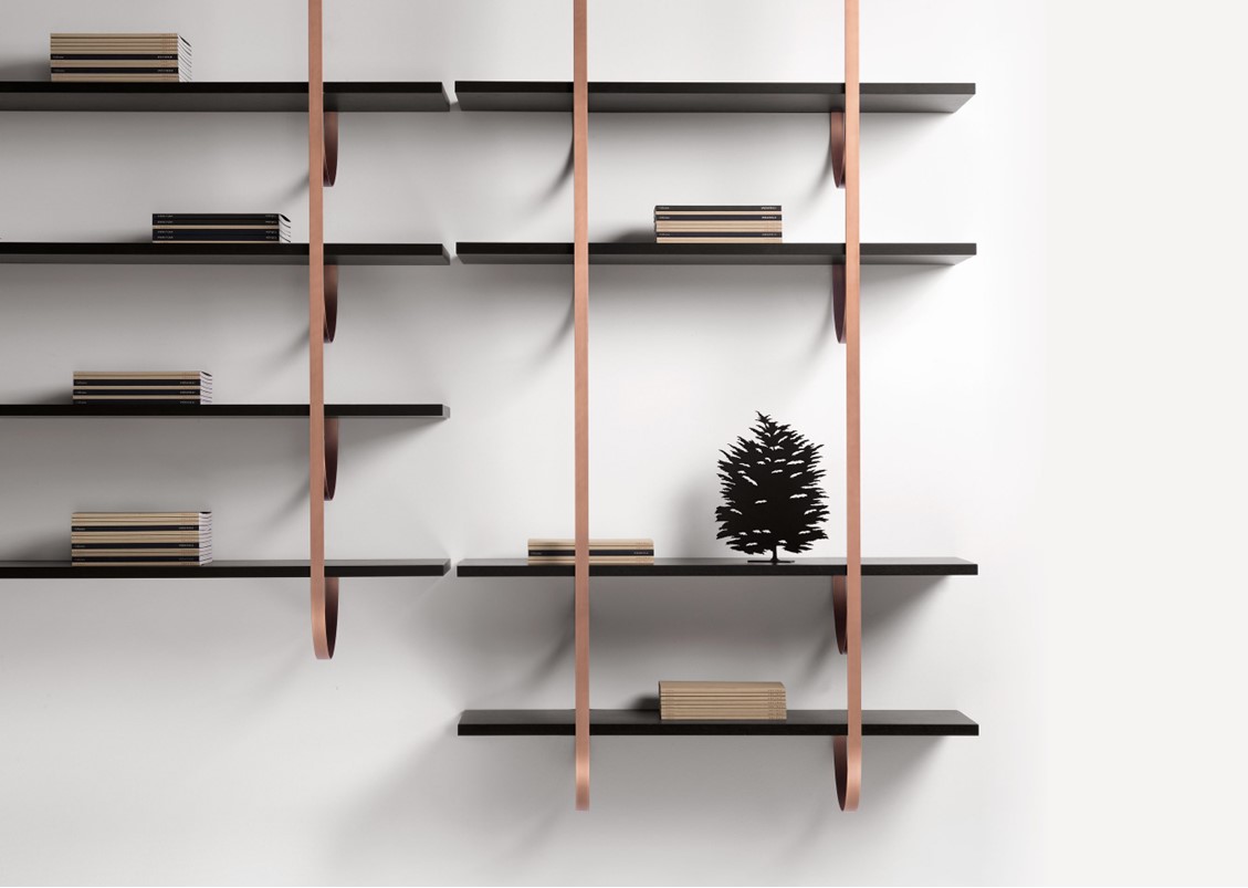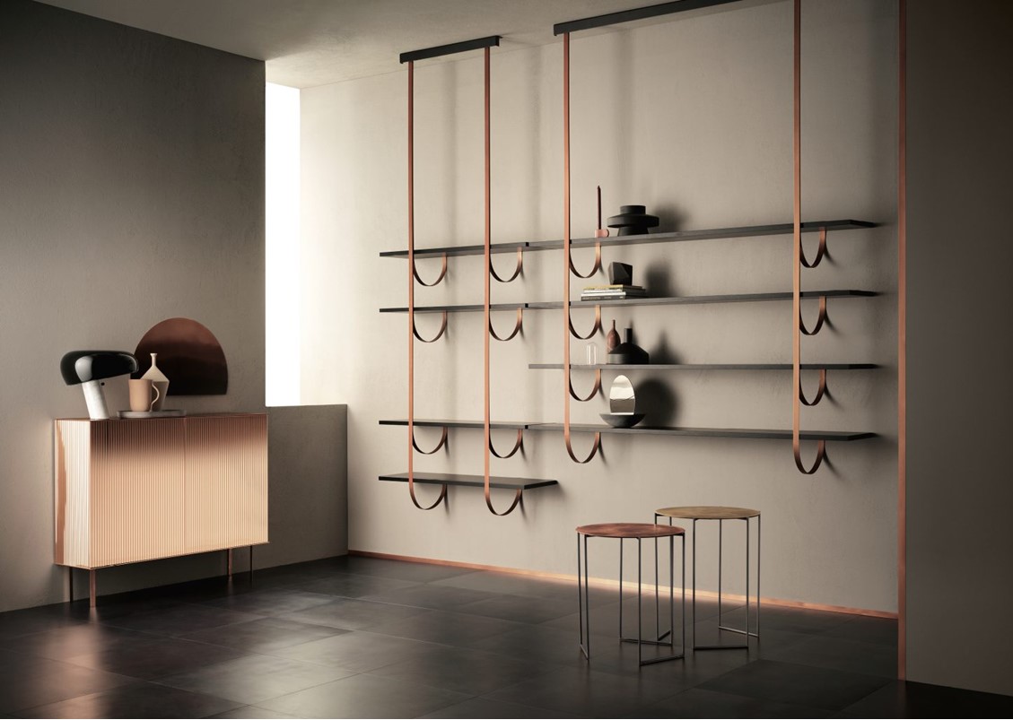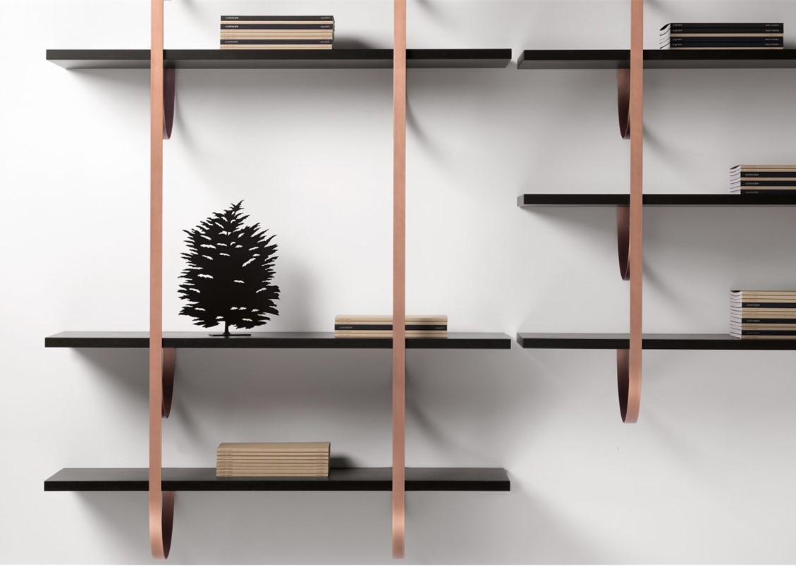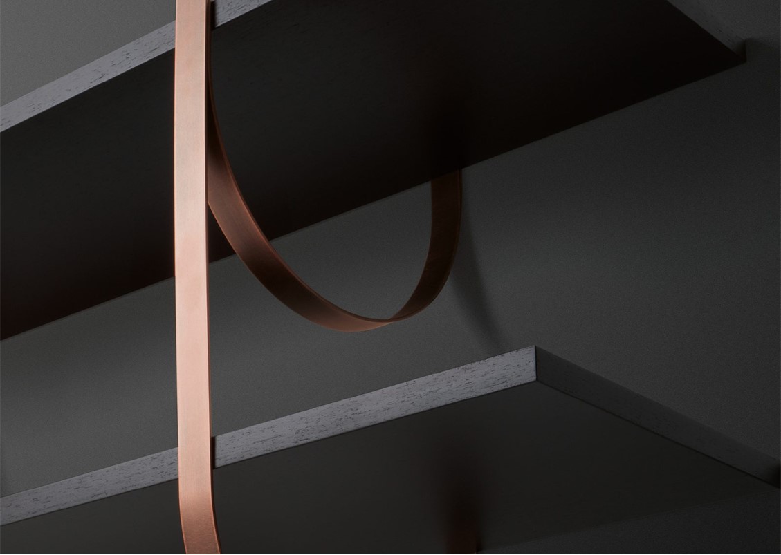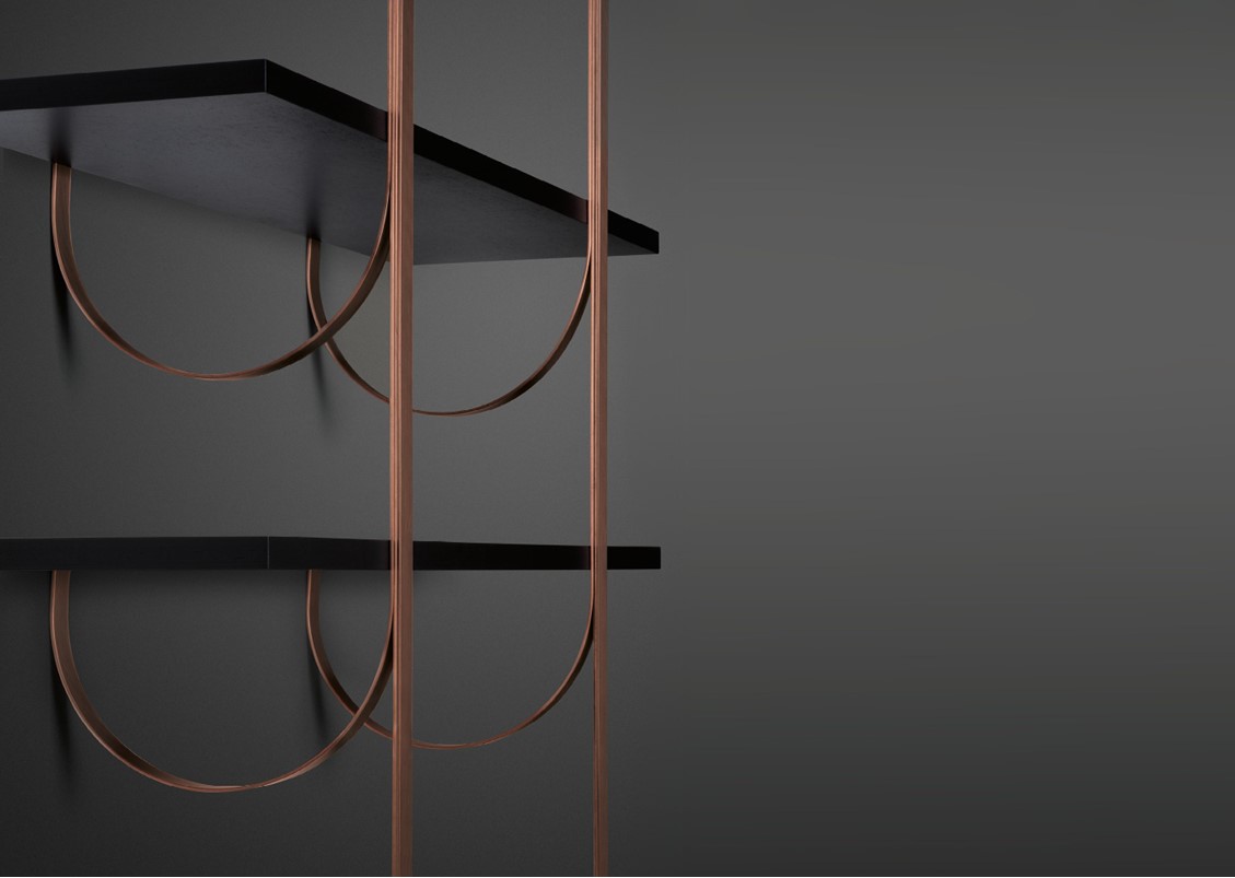 Thin perpendicular supports fall from the ceiling to be anchored to the wall in delicate curves. Like climbing vines, they create a new kind of suspended architecture. Each branch becomes a support for one or more shelves in a modular composition with clear botanical inspiration. The gaze bounces between the dark hues of the Gabon Ebony shelves and the luminous supports in brass, copper, and iron.