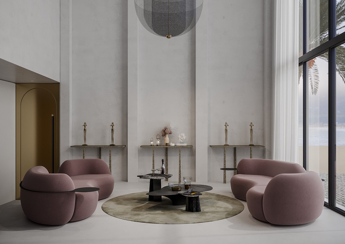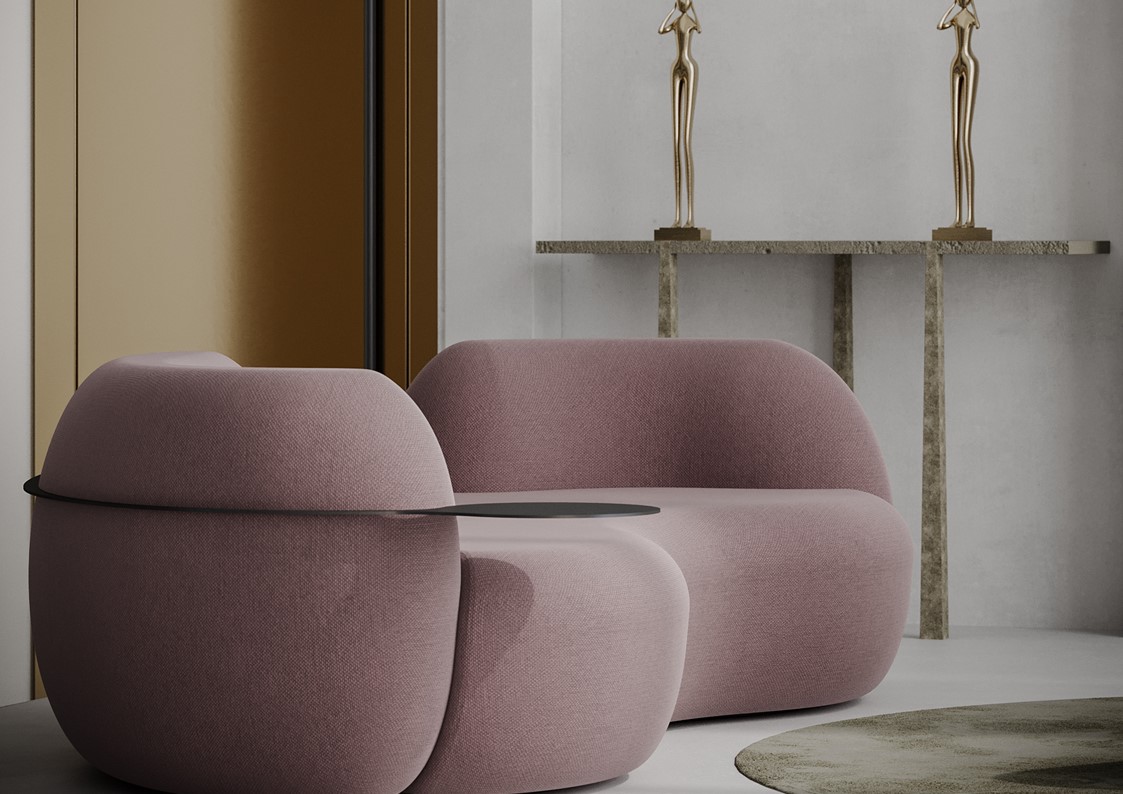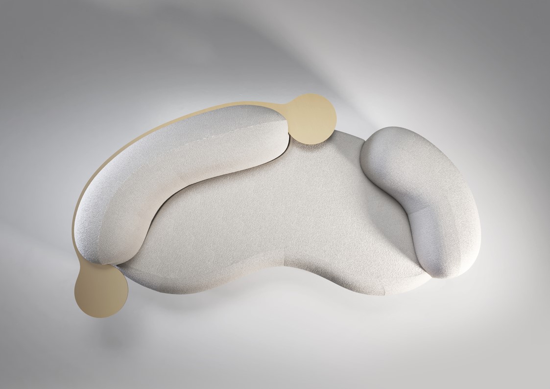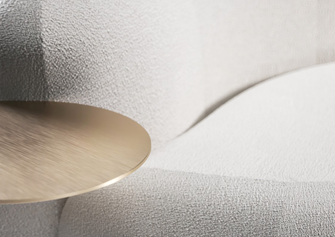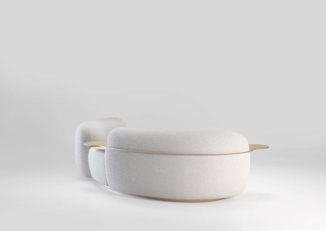 Tateyama is a conversational sofa characterized by its soft curves & unusual shape which encourages the users to engage with one another. It is both welcoming & comfortable. A gap has been carved out of the backrest, opening the sofa up to the rest of the room. The sofa is available with or without the incorporated side tables, which are supported by a continuous metal belt. The sofa can be upholstered in a number of different materials including COM. The metal element is available in a number of metal finishes including polished and satin variations.