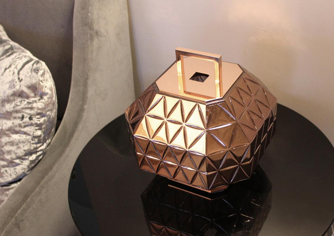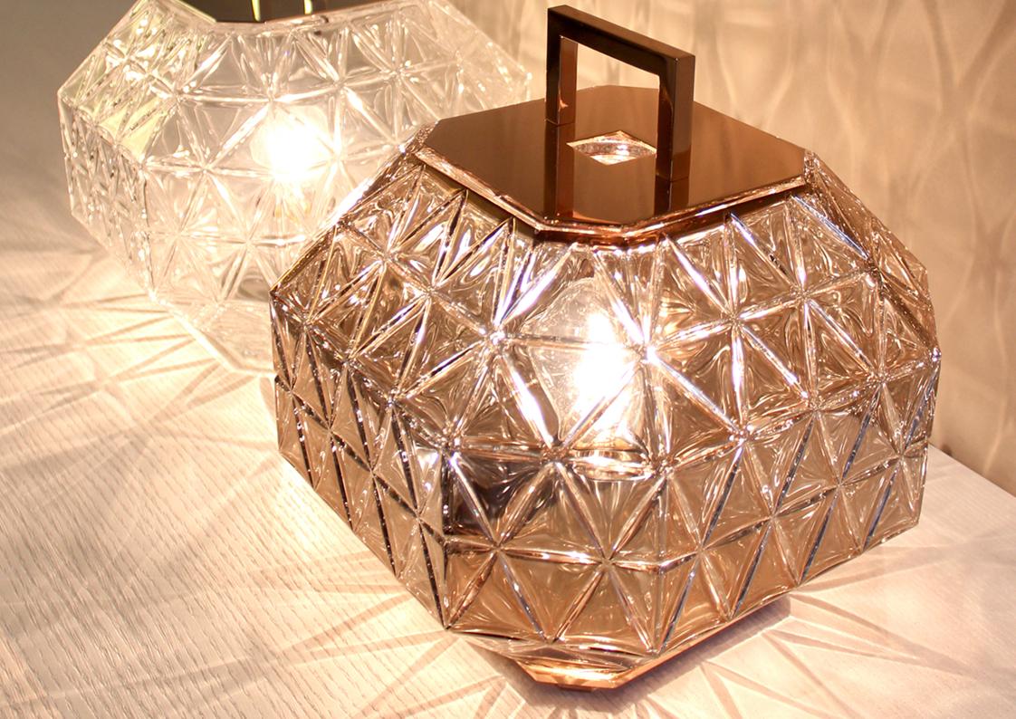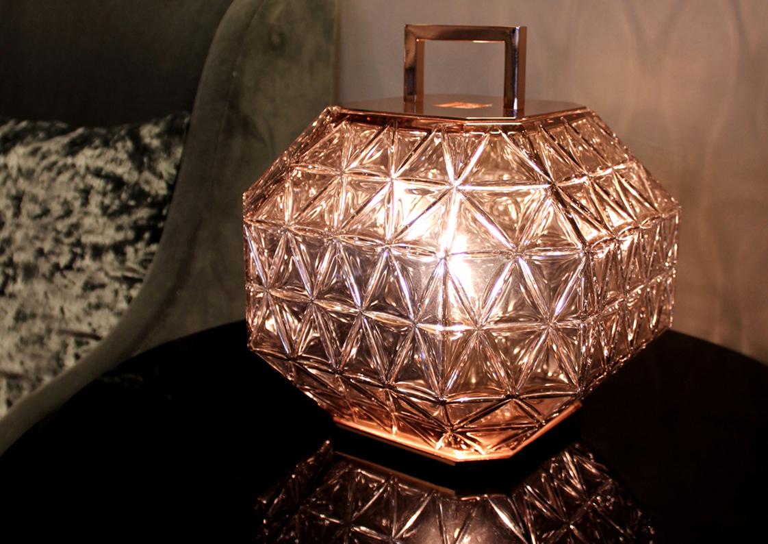 Treasure Deluxe Table Lamp features a hand blown clear or rose gold crystal diffuser polished and engraved with base, handle and inset finish in polished rose gold. Black fabric cord with dimmer control – requires one 60 watt medium base incandescent lamp, not included – UL listed.