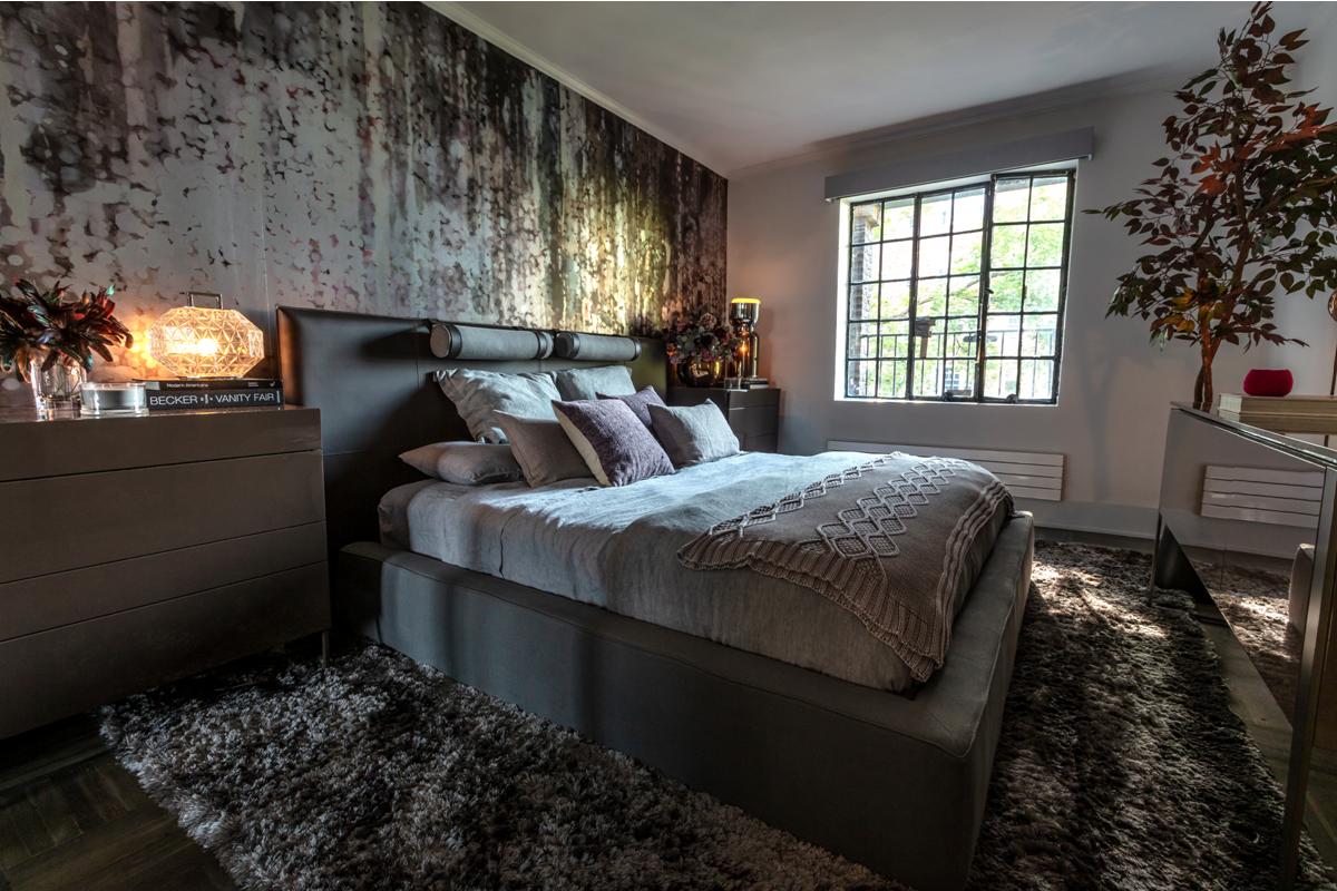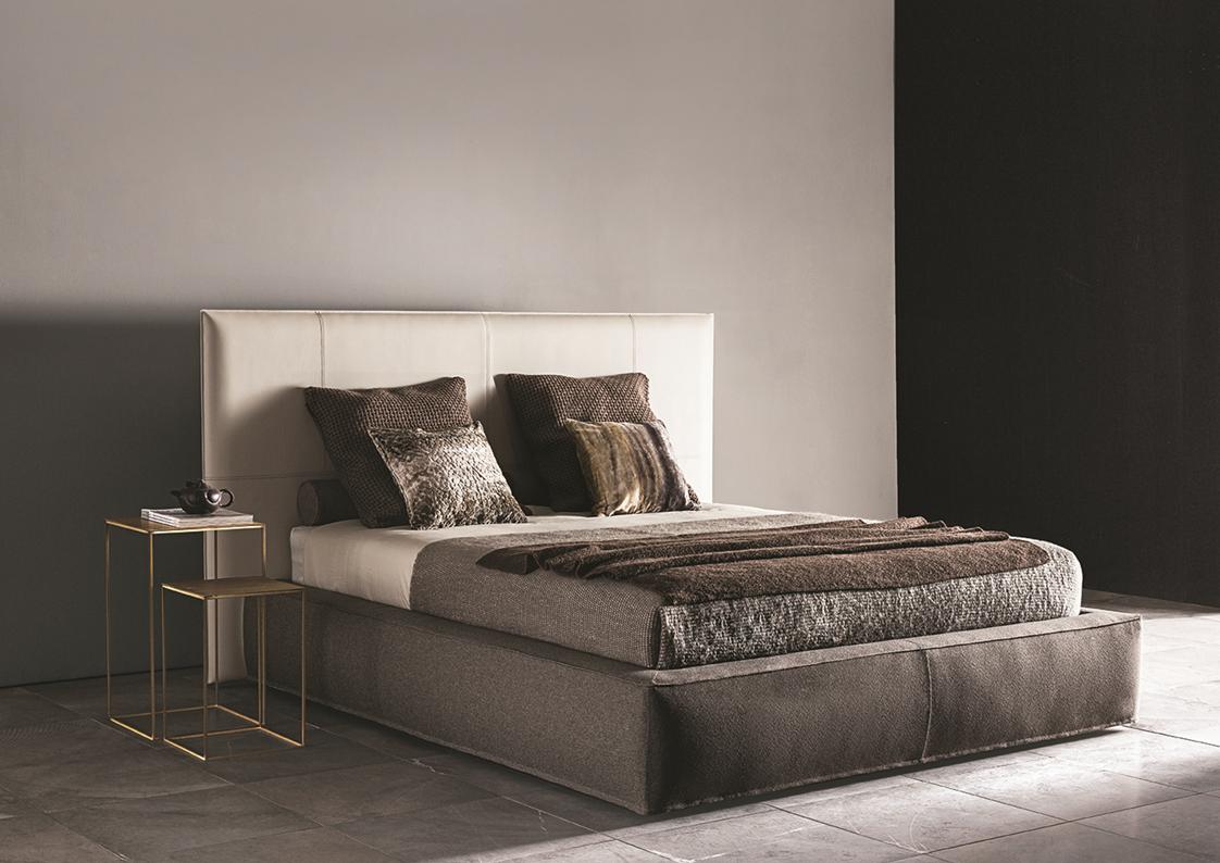 The Tube Platform Bed has charm + originality – the Italian saddle-leather headboard is enhanced by adjustable roll cushions in an assortment of fine Italian fabrics. Additional side panels can be added to the standard bed for a more dramatic look on one or both sides.