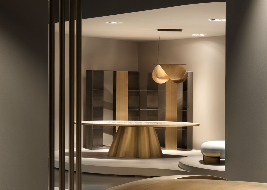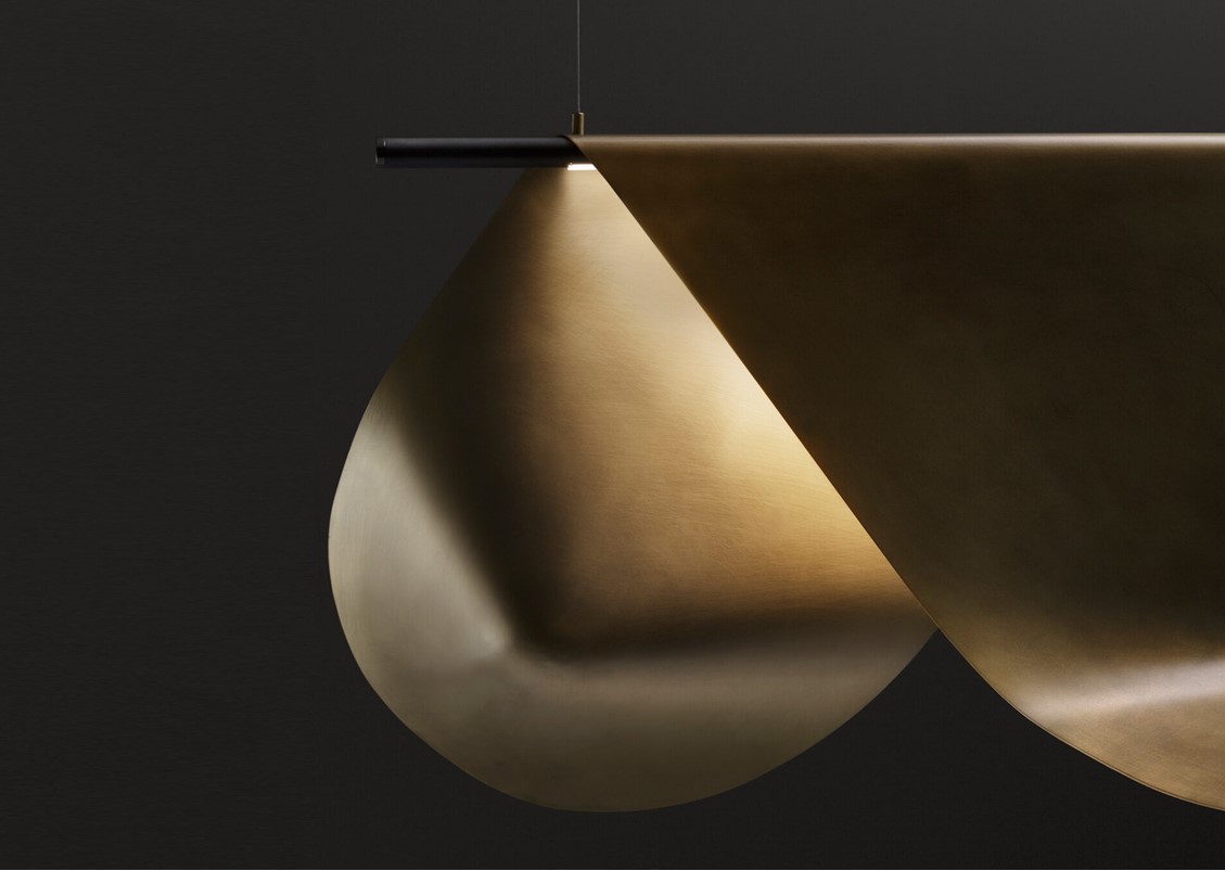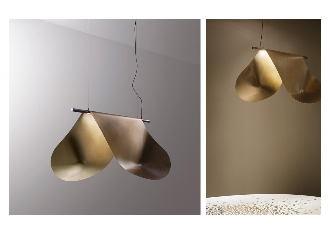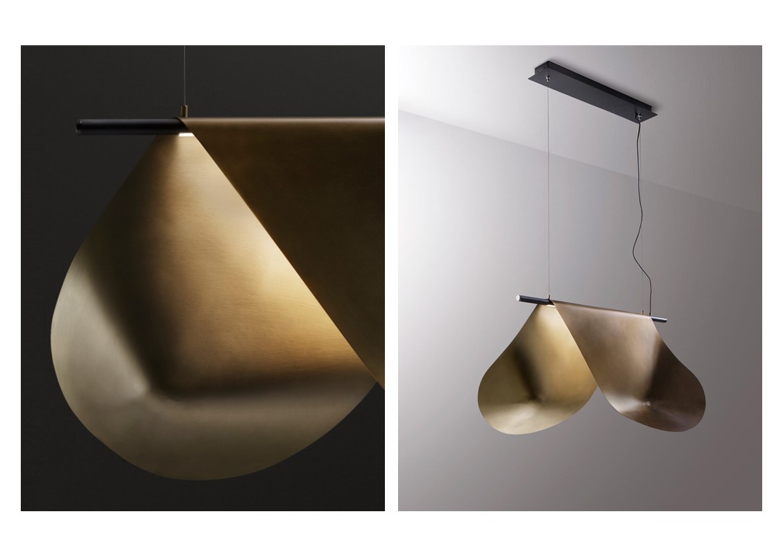 A two-dimensional metal surface becomes three-dimensional thanks to hand-crafted processes: folding, hammering, bending, and soldering generate different light diffusers inspired by the complex shapes of conoids, starting from a single outline. Each volume is assigned to a different type of lamp (suspended, table-top), suggesting the ways in which metal offers various interpretations and possibilities. The finishes and processes combine to play with the alternation of brushed and oxidized, reflecting light in unexpected ways from piece to piece.