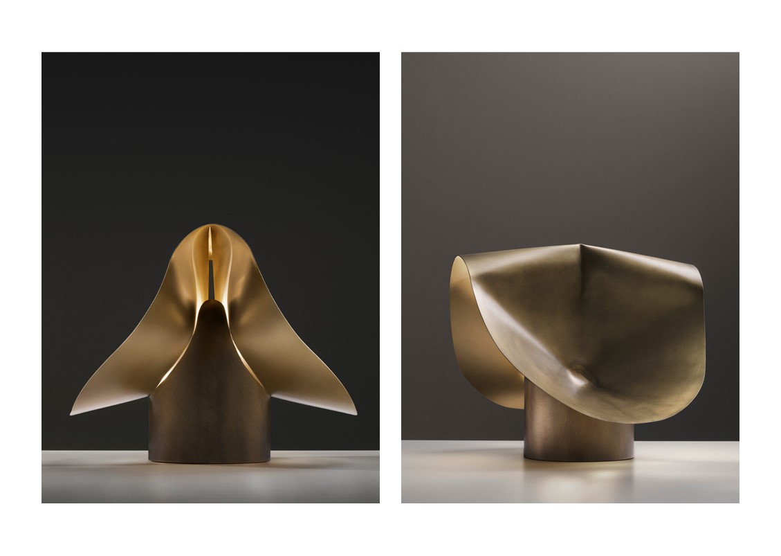 A two-dimensional metal surface becomes three-dimensional thanks to hand-crafted processes: folding, hammering, bending, and soldering generate different light diffusers inspired by the complex shapes of conoids, starting from a single outline. Each volume is assigned to a different type of lamp (suspended, table-top), suggesting the ways in which metal offers various interpretations and possibilities. The finishes and processes combine to play with the alternation of brushed and oxidized, reflecting light in unexpected ways from piece to piece.