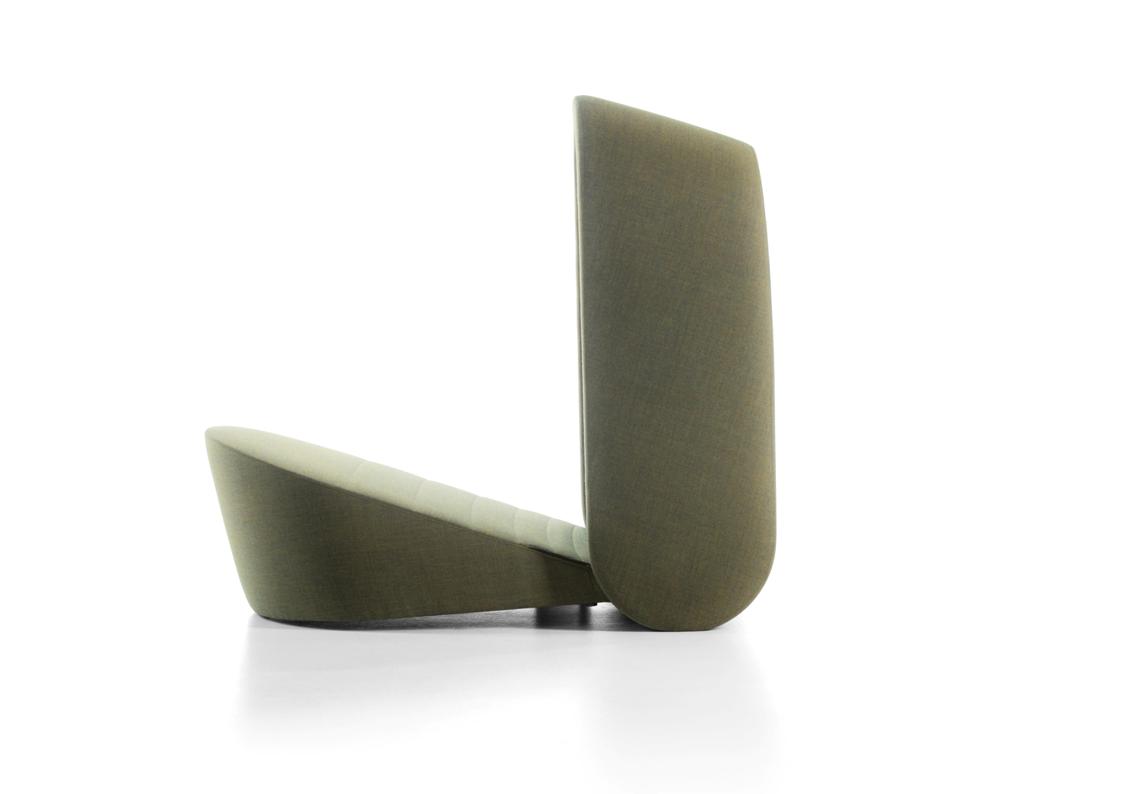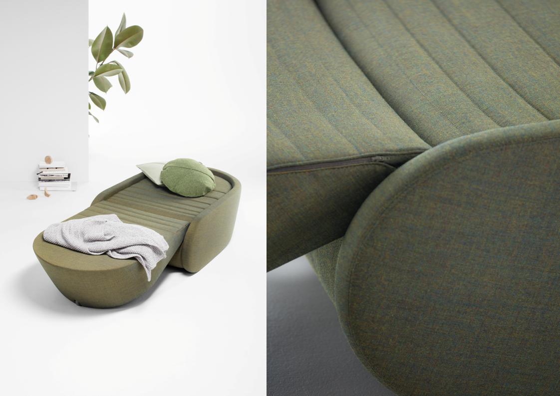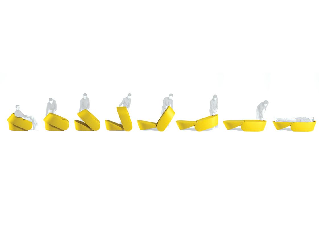 Up-Lift represents innovation in armchair typology with its integrated bed. Its shape allows for transformation through the simple raising UP of the back rest, which causes the automatic LIFT of the leg rest, whilst maintaining an optimal height. Its harmonious form consists of two separate volumes, which rotate around each other in an eccentric fashion. The armrest is curved, as it also functions as a wheel, and the backrest is tilted and rounded to minimise the volume. These curvatures are what characterise Up-Lift. Besides its specific rotation, harmonious ergonomics and shape, every detail of Up-Lift has been carefully thought out and designed. Special attention was given to the lower construction. Elastic bands and high quality foam placed at strategic points allow for maximal comfort and minimal bulk.
