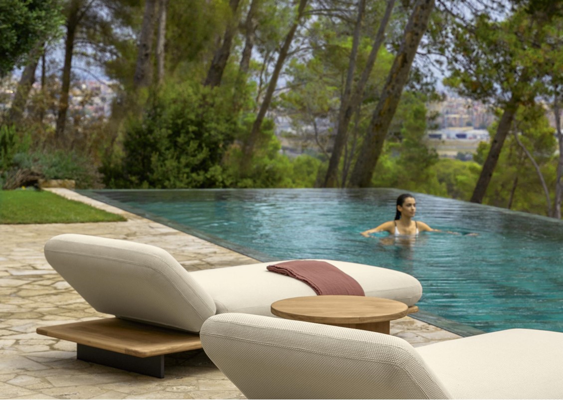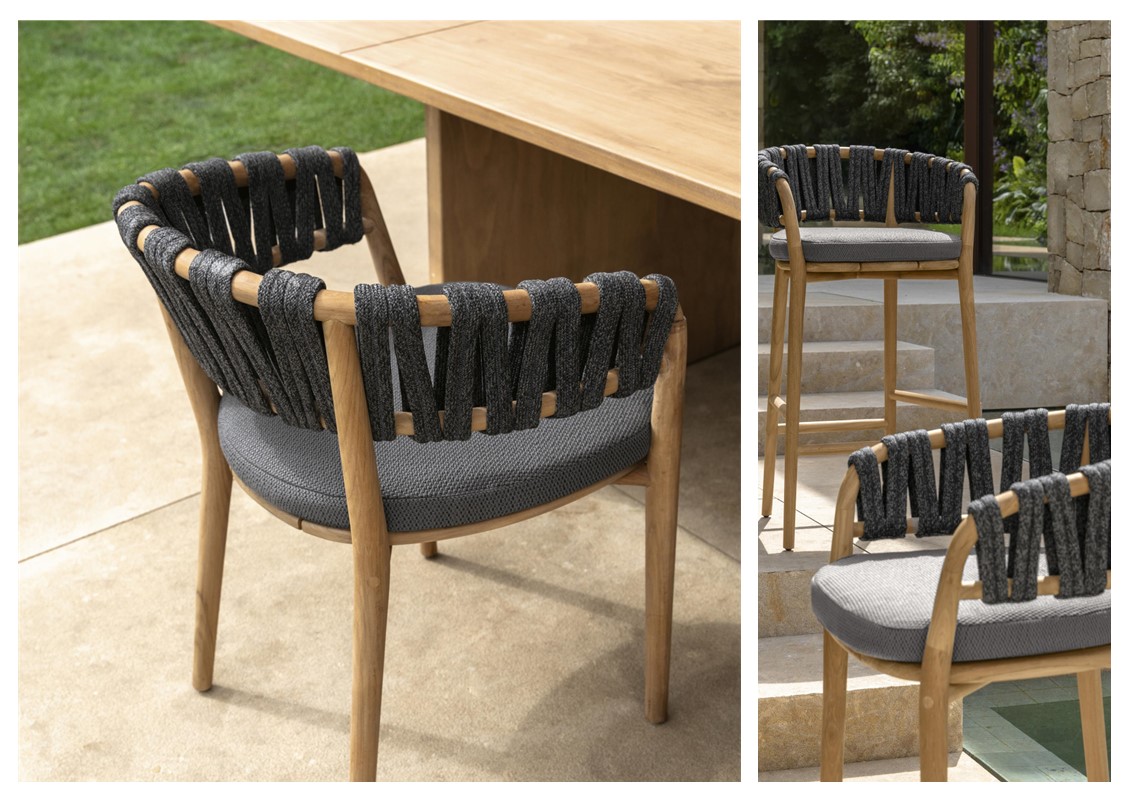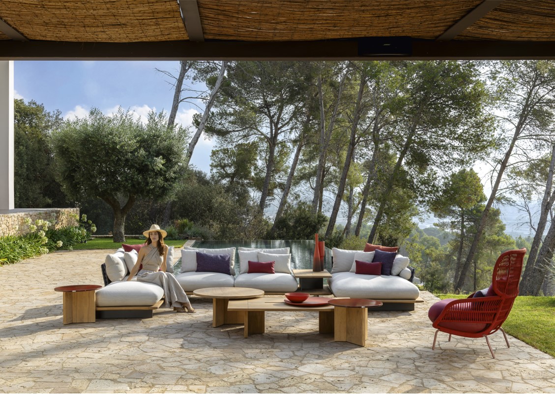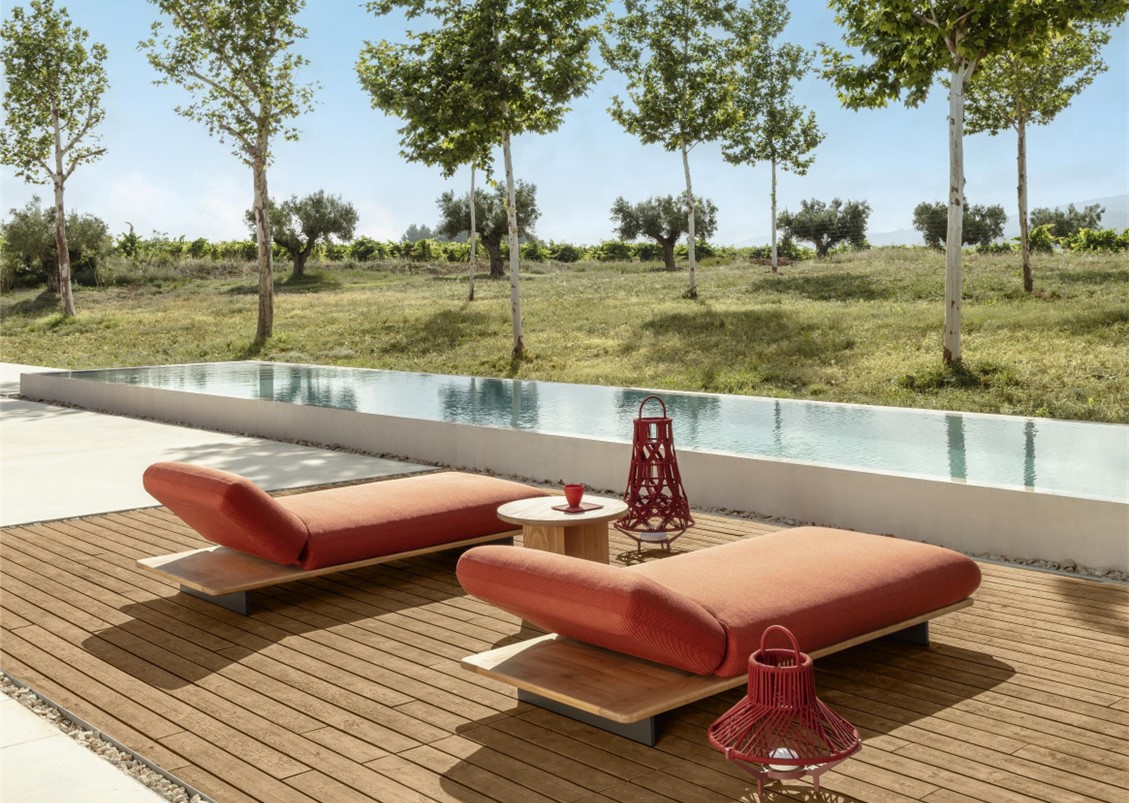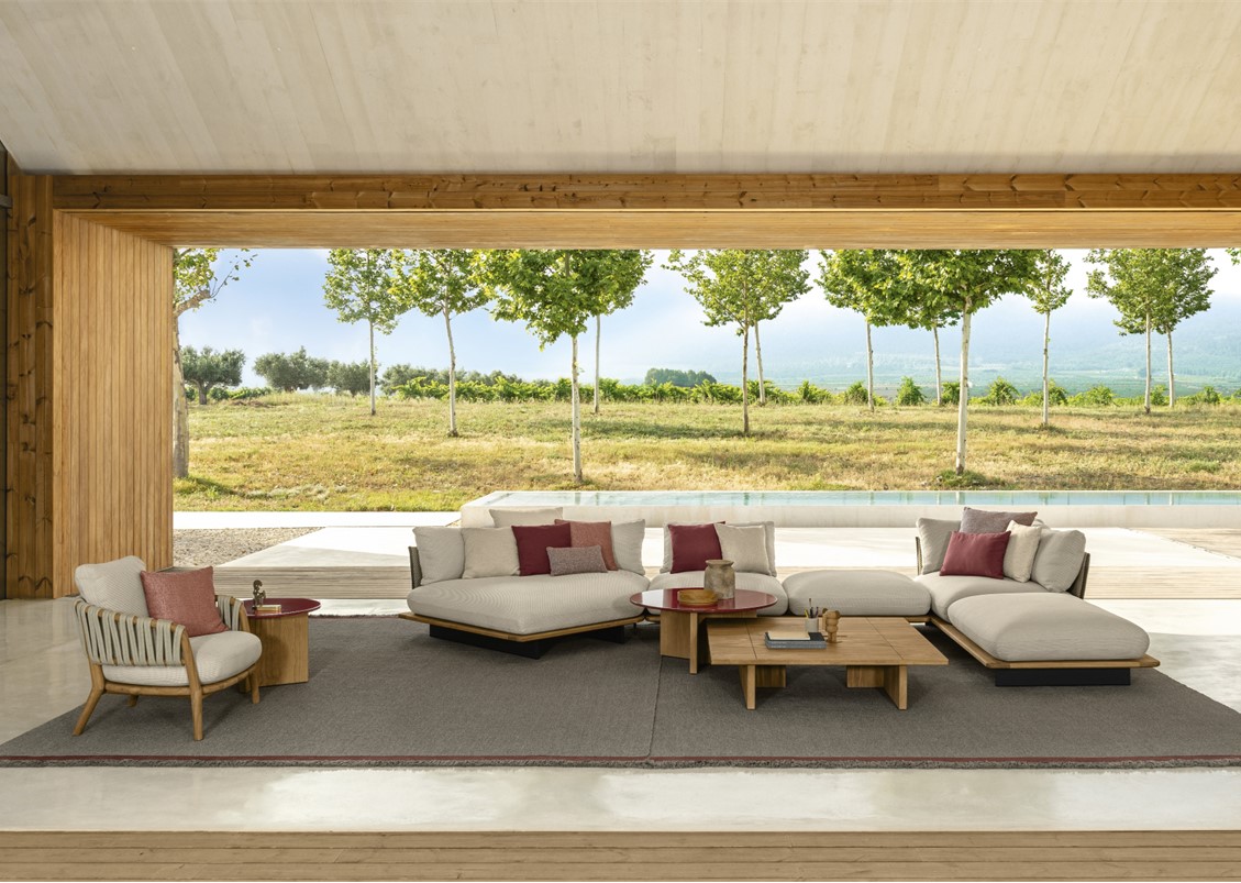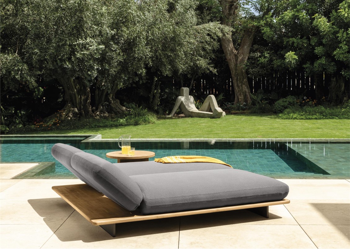 materials: natural teak, outdoor fabrics, gloss painted + quick dry foam