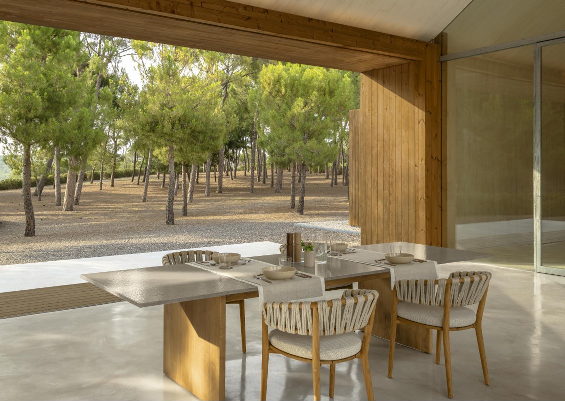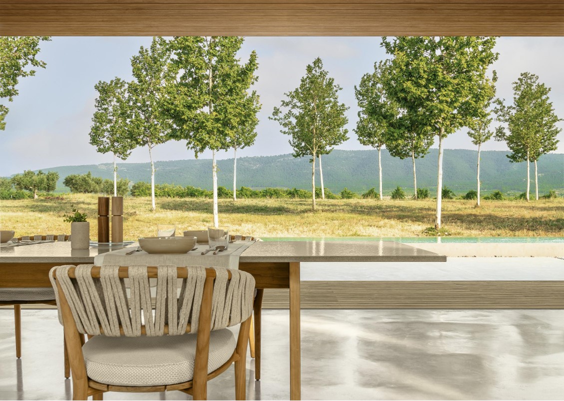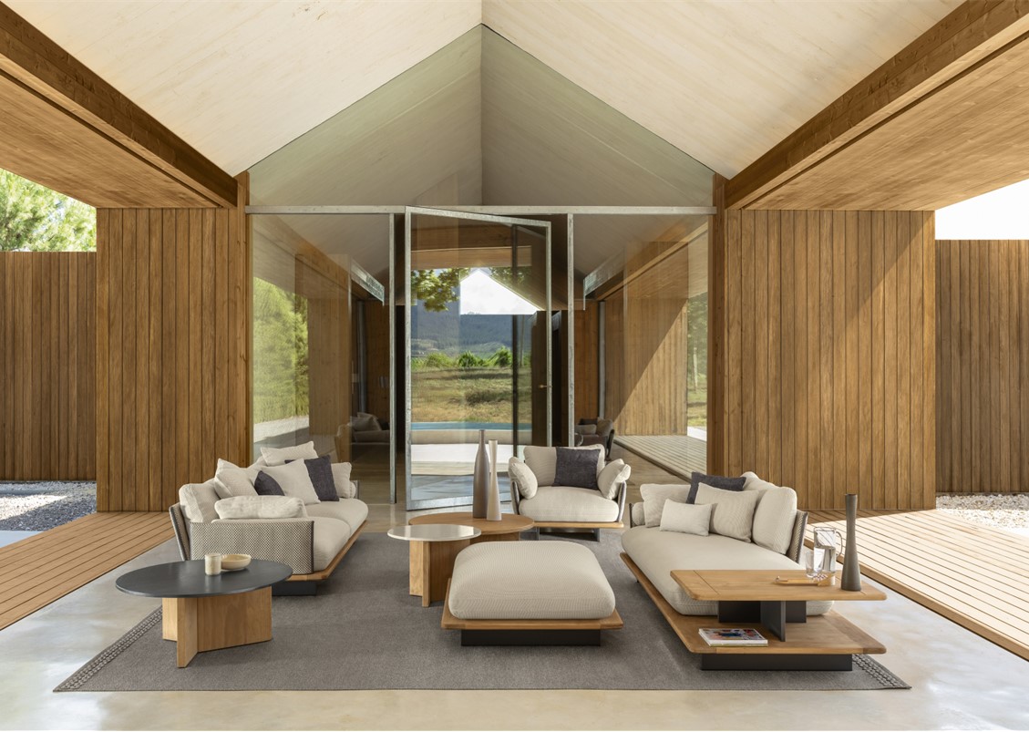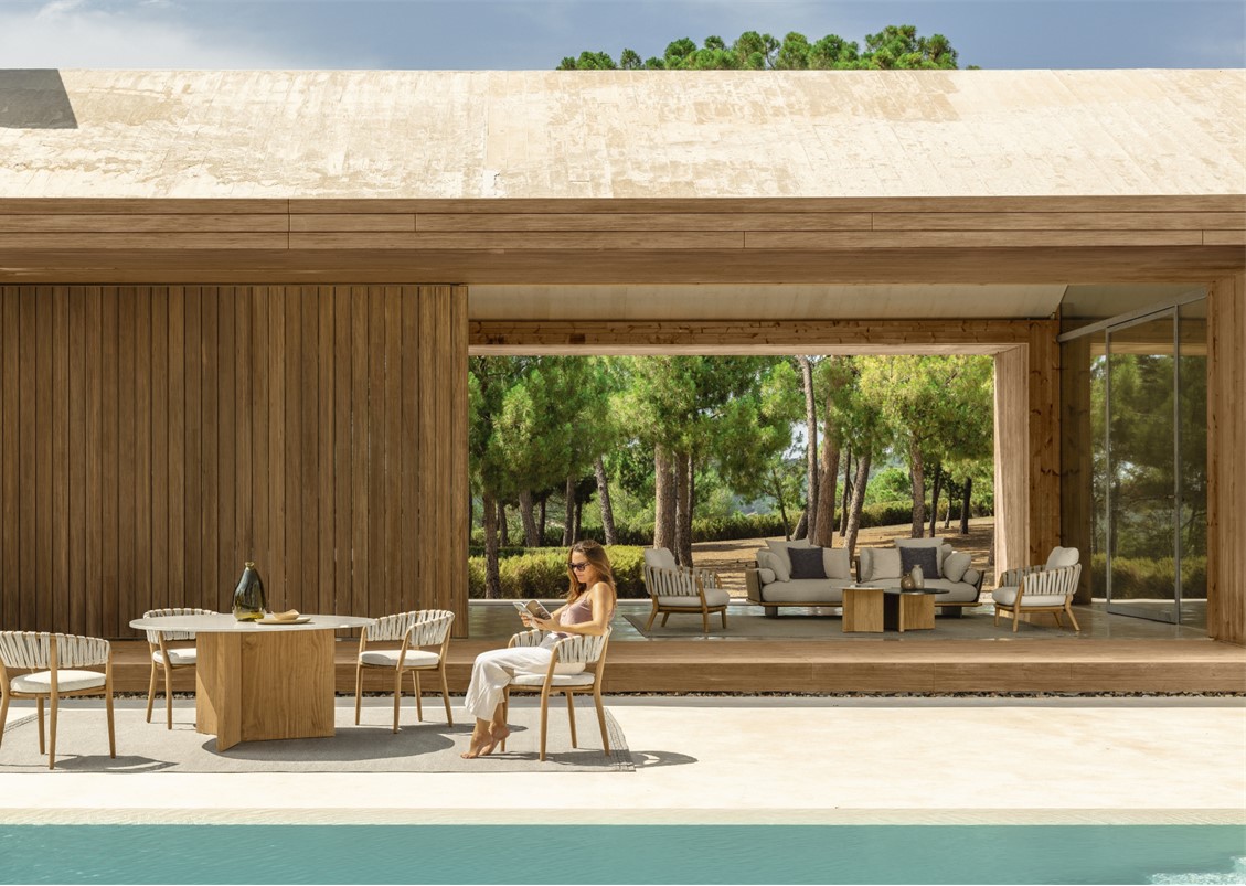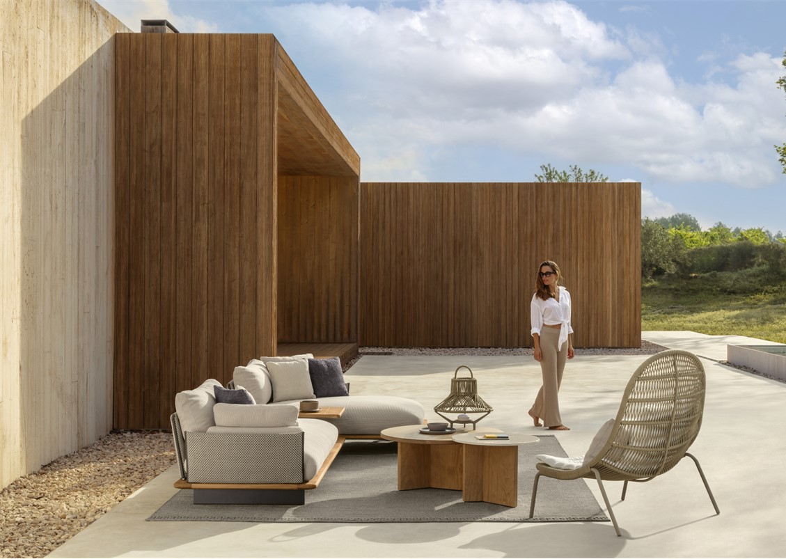 The desire for lightness manifests in the furnishing elements that appear to float in Venice, a collection inspired by the city itself, created by the Palomba-Serafini studio. Similar to boats gliding on the waterway, large seats with soft curves are positioned on sturdy wooden bases, from which emerge, like the handcrafted parapets of a vessel, backrests, and armrests adorned in a full nautical style. The monolithic and elegant lava stone tables exude a shiny ceramic finish that evokes the warm hues of sunset and the cool tones of twilight in our seas.