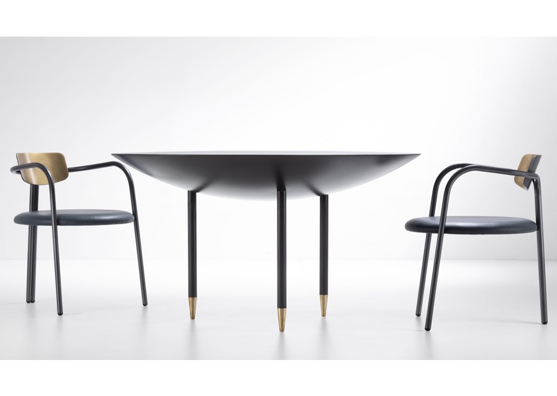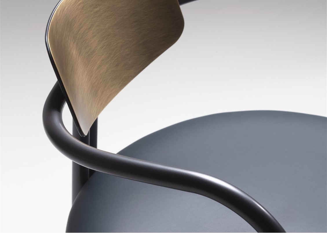 The Via Veneto Dining Chair is inspired by the 1960s and recalls the atmosphere of the Roman dolce vita. The double symmetrical tubular structure in painted stainless steel designs the feet and armrests, which support the soft leather upholstered seat and the small shaped metal backrest. The result is an enveloping armchair with carefully studied proportions, which conveys an elegant and sophisticated image. Available in deLabre brass, copper, or stainless steel + leather.