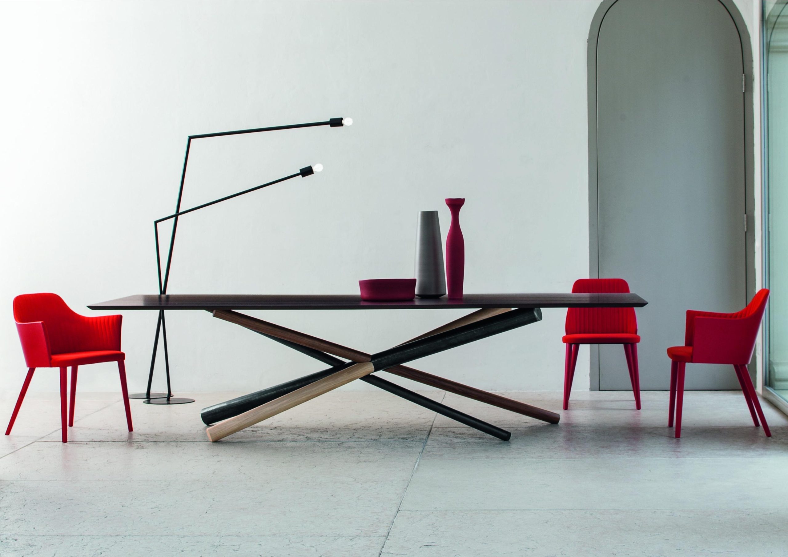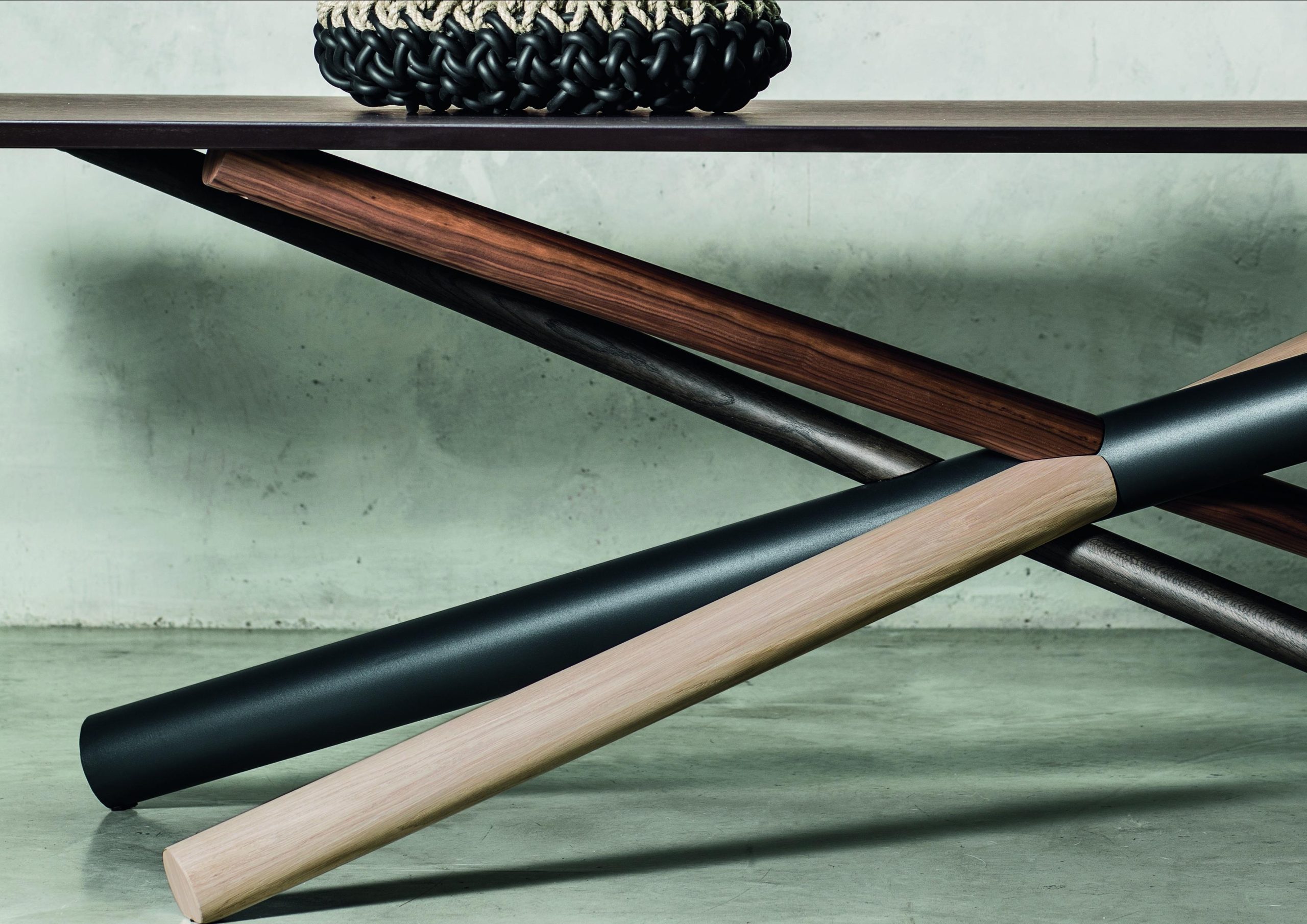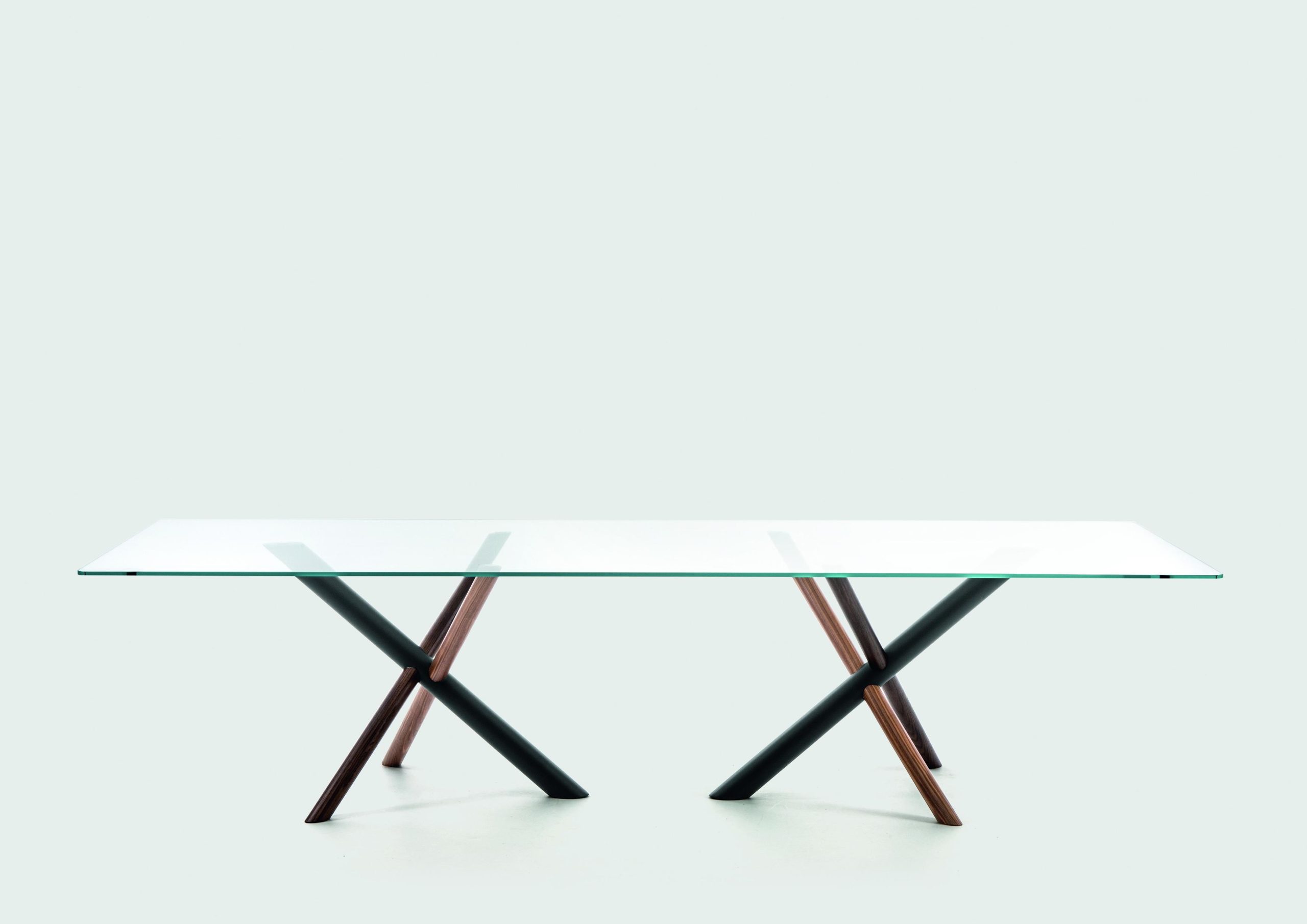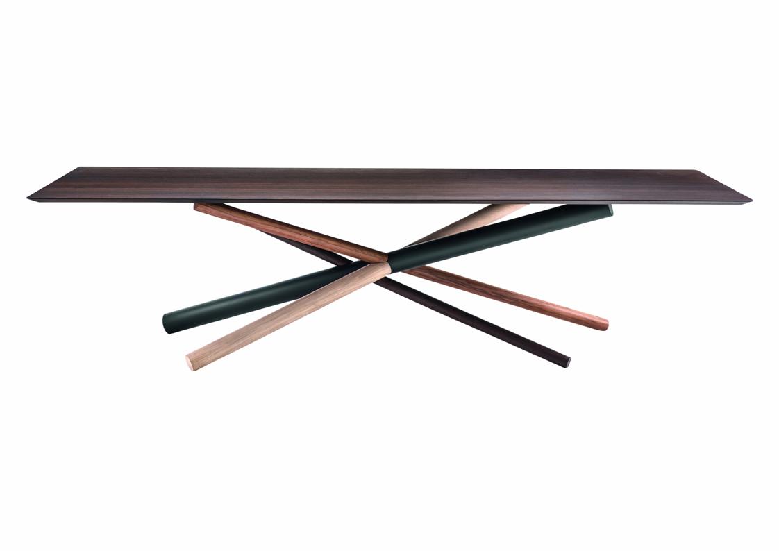 The W Dining Table is an elegant work of art – like a large-scale sculpture when not in use. Fabricated in American walnut, white aniline oakwood and heat-treated oak with a metal tube to form a knot that characterizes the W table base – Several styles including a single or double base with wood or glass top. This is a great choice if you are looking for a functional statement piece.