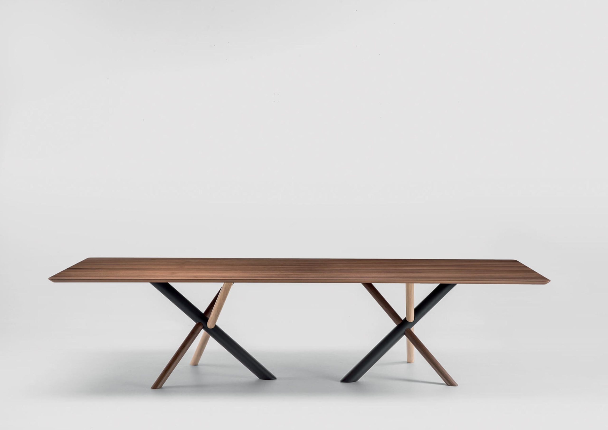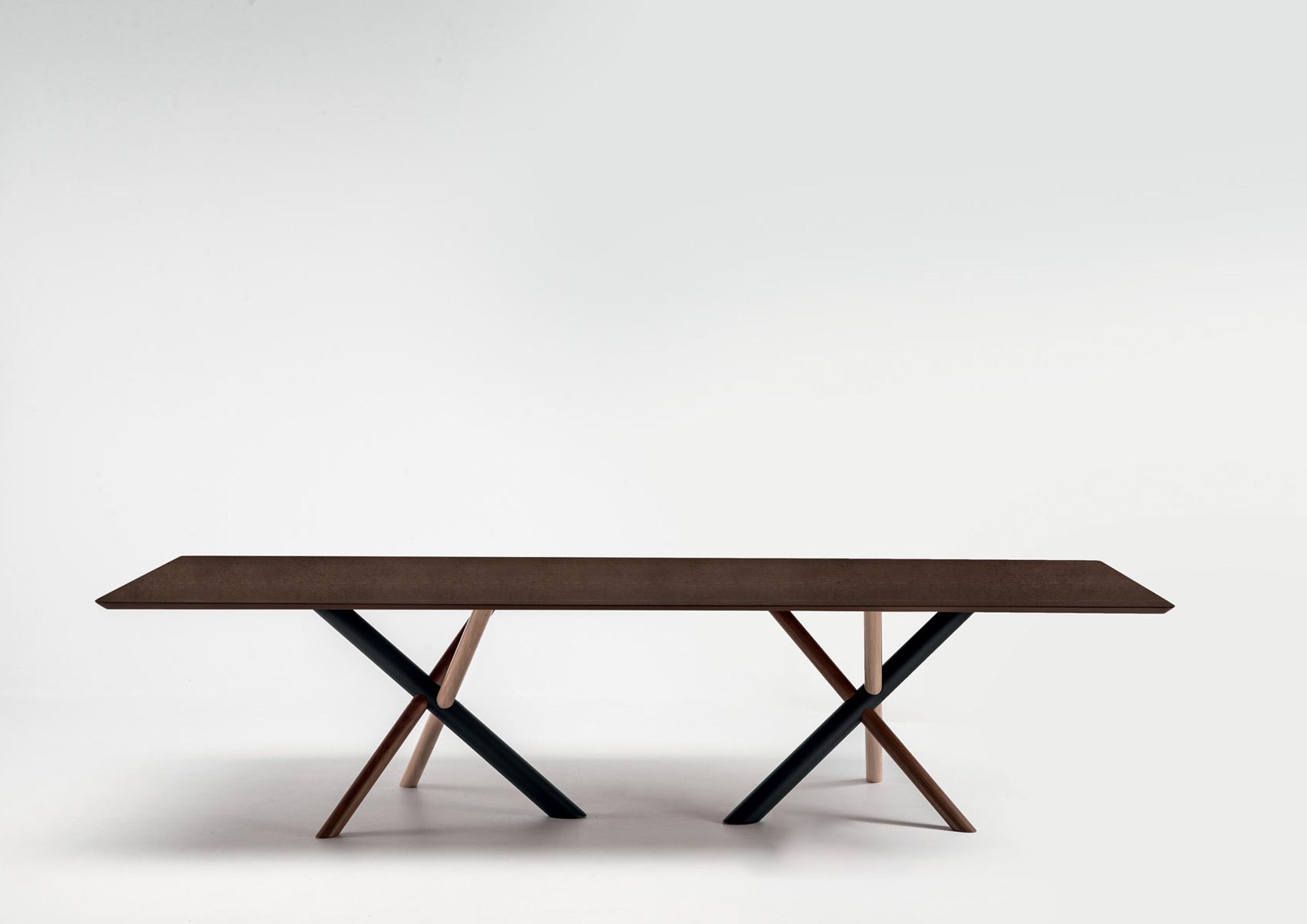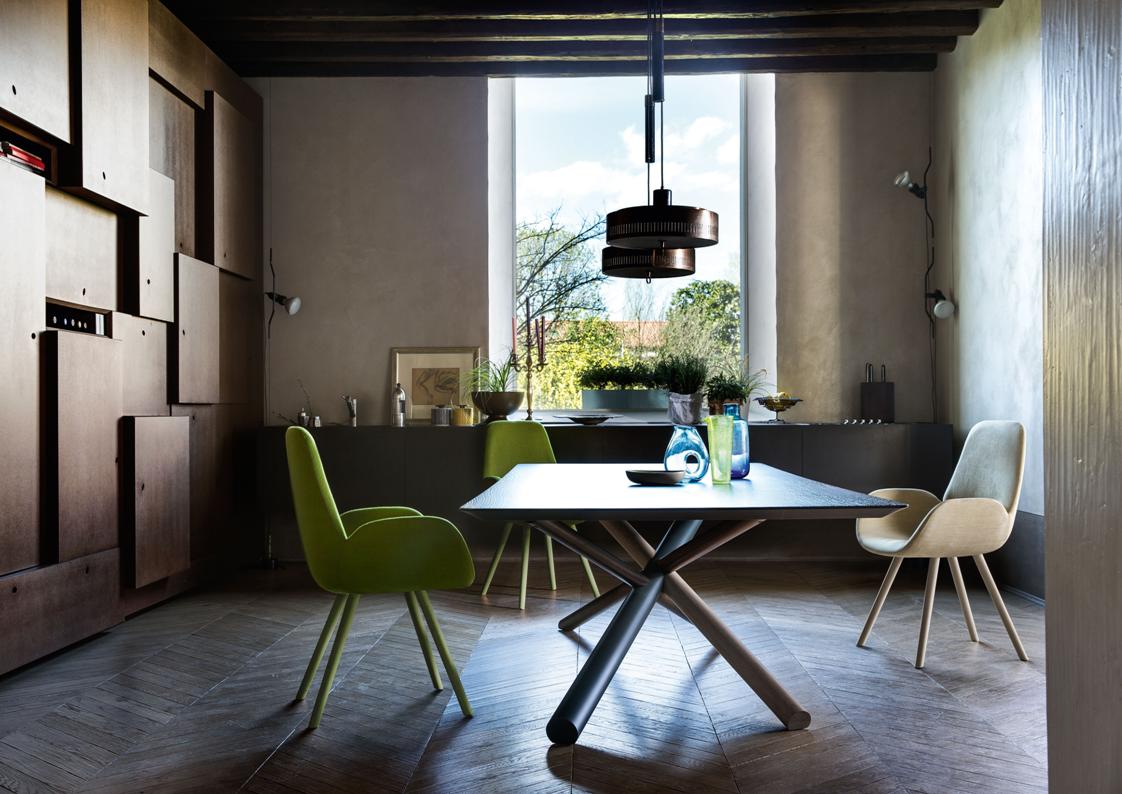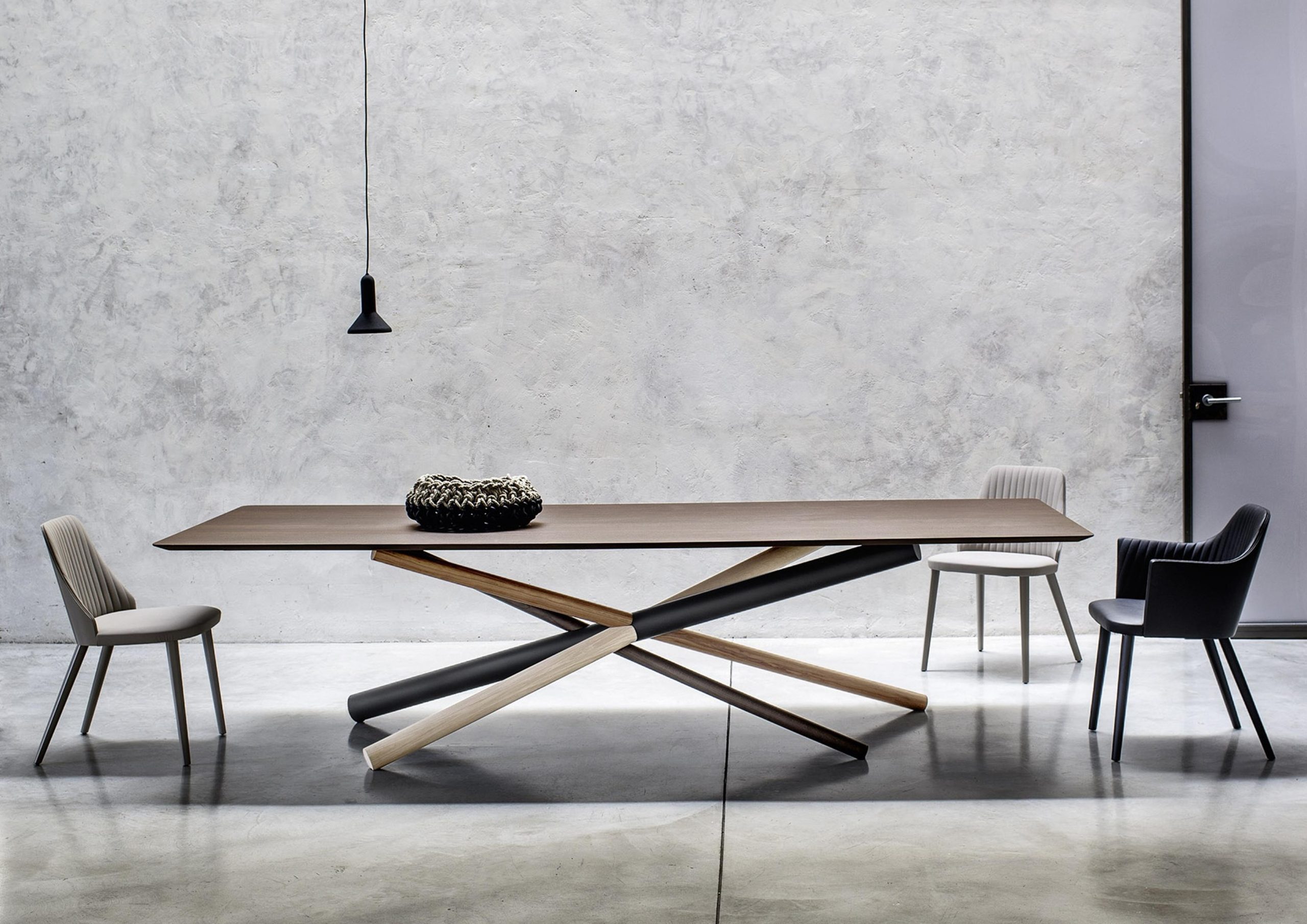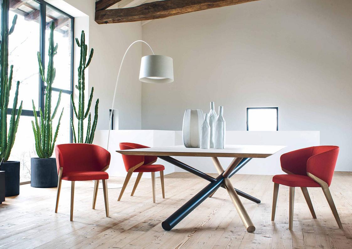 The W Dining Table is an elegant work of art – like a large-scale sculpture when not in use. Fabricated in American walnut, white aniline oakwood and heat-treated oak with a metal tube to form a knot that characterizes the W table base – Several styles including a single or double base with wood or glass top. This is a great choice if you are looking for a functional statement piece.