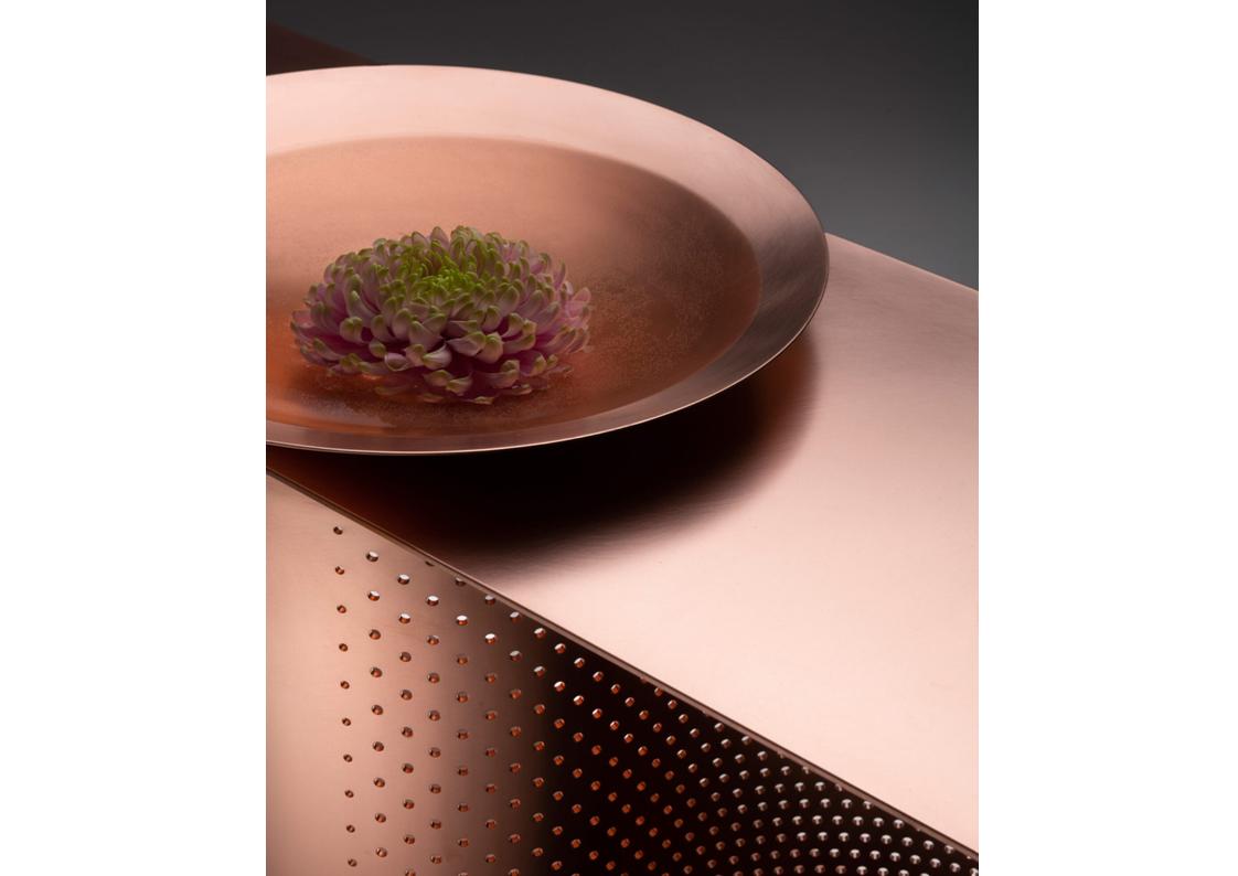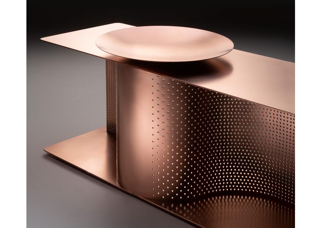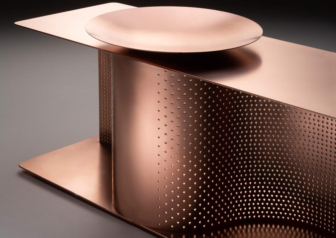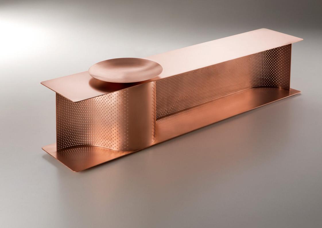 With its essential shapes and gentle, sinuous sense of movement, the Wave Shoe Bench suggests a renewed, more conscious focus on the ritual of arriving home – this piece reinterprets a quintessential piece of Asian furniture. Its humble function as furnishing is both welcoming and suitable for gracing even the most sophisticated of interiors. The micro architecture, designed with simple, flowing forms, is produced using solid natural copper which plays with curves, solids, and voids. The vertical wave-shaped wall in perforated copper lends lightness to the volume and adds a touch of refinement to the sculptural form. The bench surface provides ample space to sit, while the base provides storage space for bags and shoes. Natural copper, free of surface treatment, becomes a living material that changes over time and acquires a range of hews caused by differing rates of oxidation: it remains brighter in areas where there is more frequent contact, thus emphasizing the routines of those who use it every day. by private commission only – please inquire.