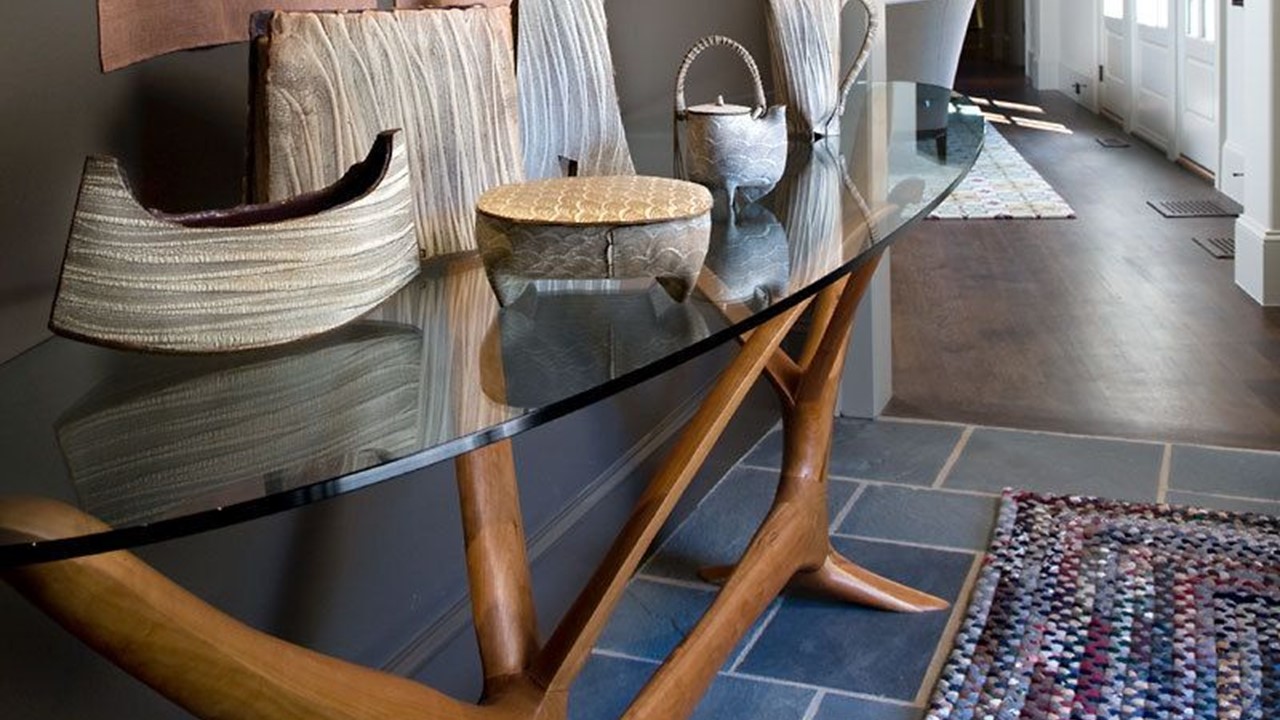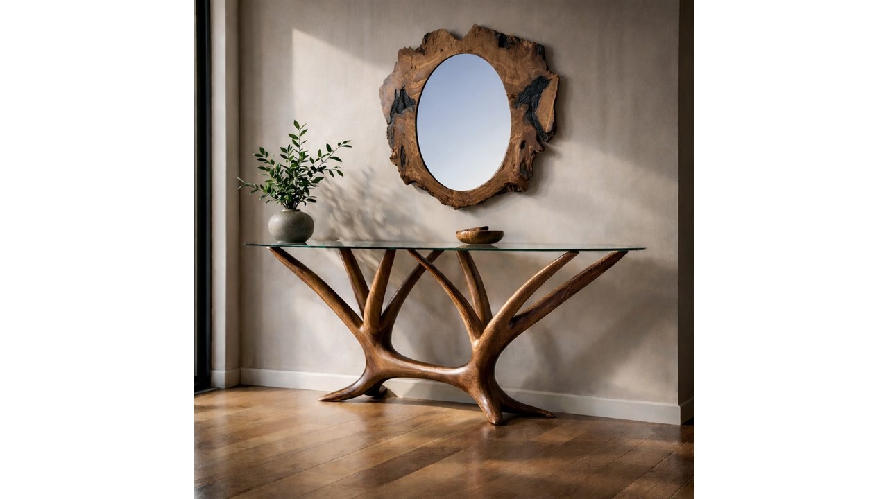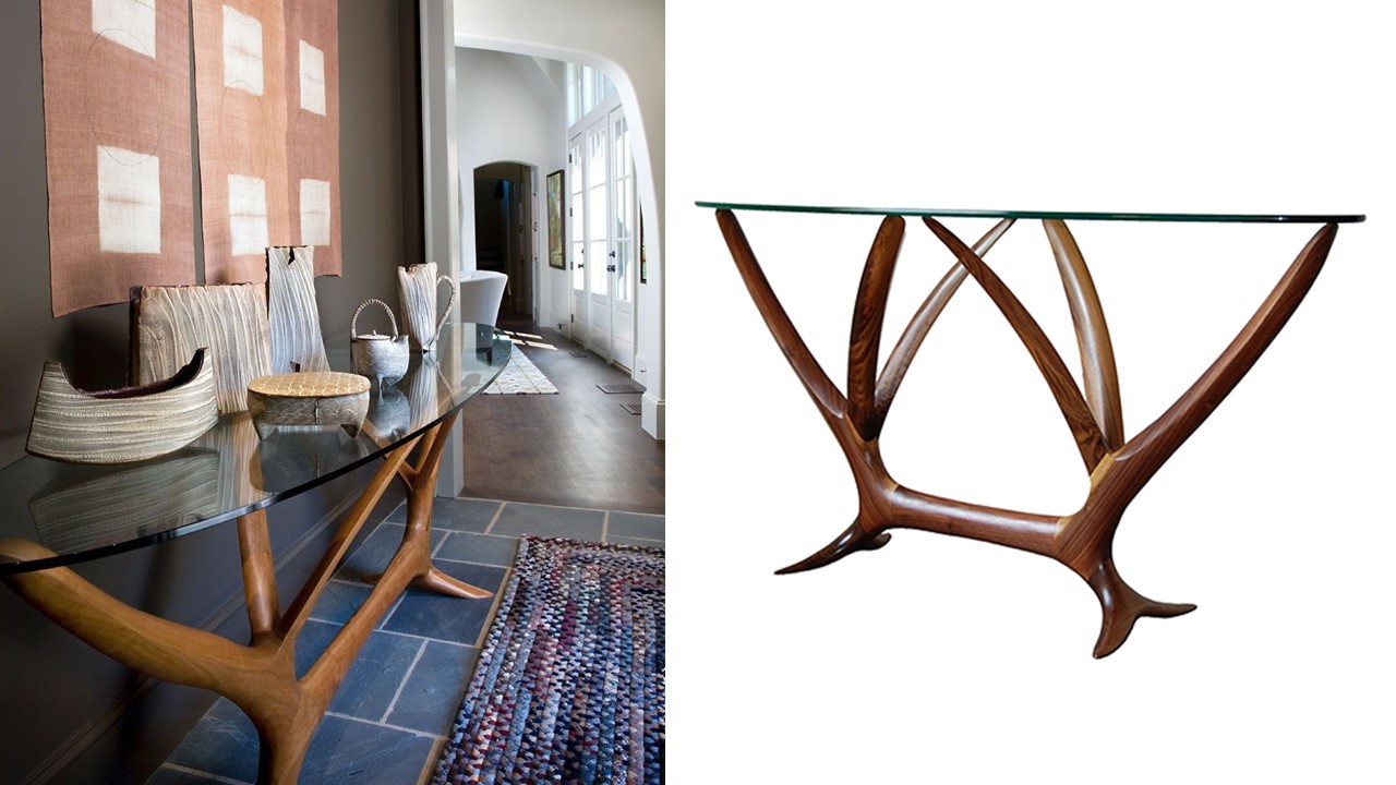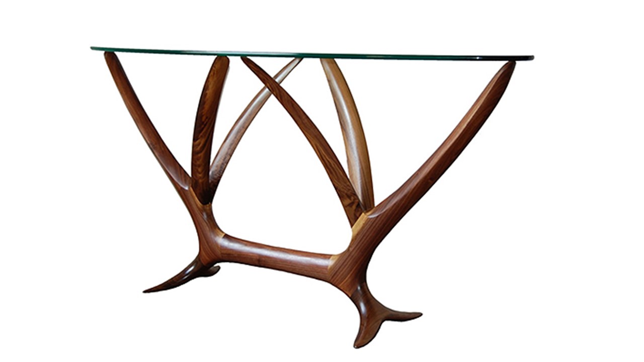 The Wisteria Console by Brian Fireman is a masterful exploration of organic form and sculptural woodworking. Handcrafted from solid hardwood, the base is composed of flowing, branch-like elements that intersect and rise with a natural, almost botanical rhythm—revealing Fireman’s deep inspiration from landscape, growth, and structure. Topped with a refined glass surface, the design allows the full sculptural composition below to remain visible, emphasizing the interplay of line, tension, and negative space. Each joint and transition is meticulously shaped and hand-finished, highlighting the precision and artistry inherent in Fireman’s process. Balancing structural complexity with visual lightness, the Wisteria Console functions as both furniture and sculpture.