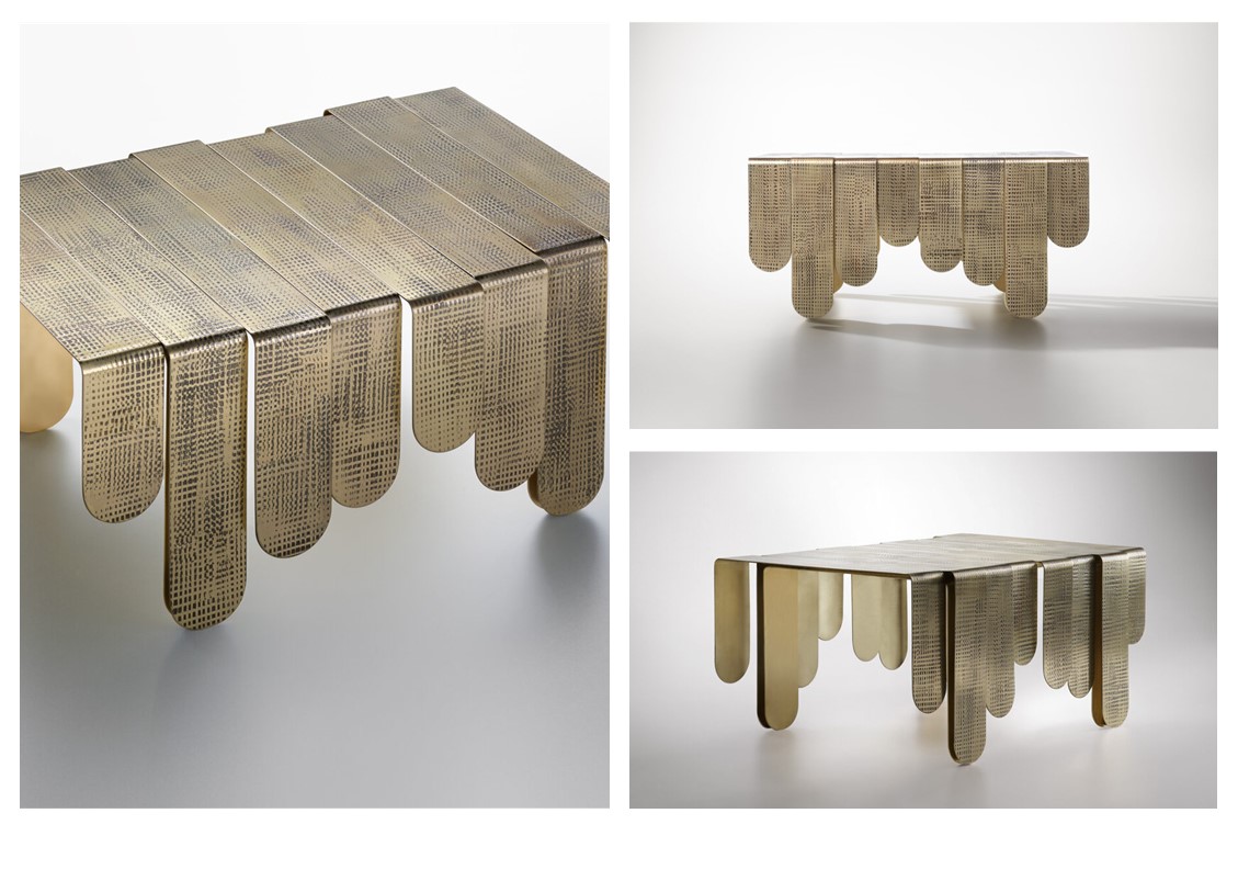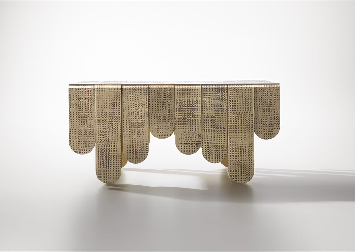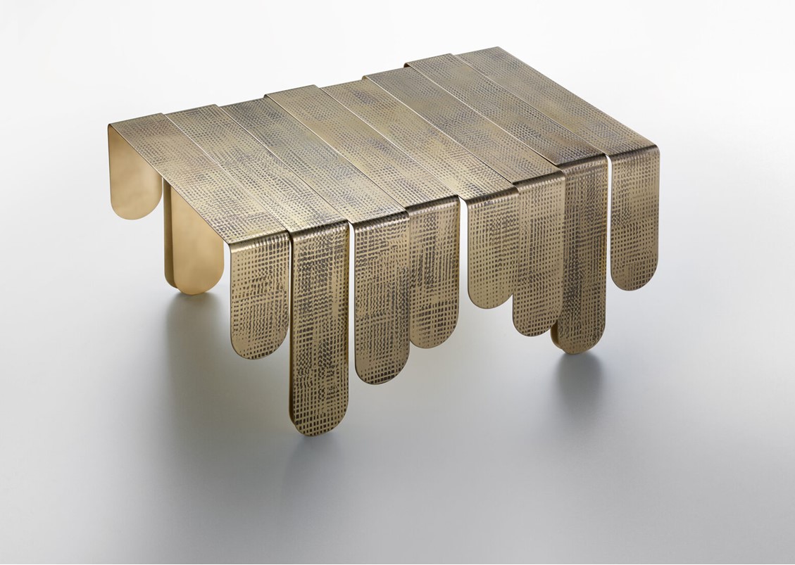 Inspired by the refined, sinuous aesthetics of Art Nouveau, the Xilo Coffee Table is a veritable sculpture in metal that exalts the hand-crafted techniques and manufacturing excellence of the company. Three sheets of thick brass, rounded at the ends and of different lengths, have been folded and abutted irregularly to create rhythmic movement. Each element features a distinct weave of imprints that dissolve in delicately fading marks, in contrast to the polished brass surface. The impressions on the surface of Xilo are the memory of manual manufacturing methods, evidence of the advanced artisanal capacity, and tireless research into the material.