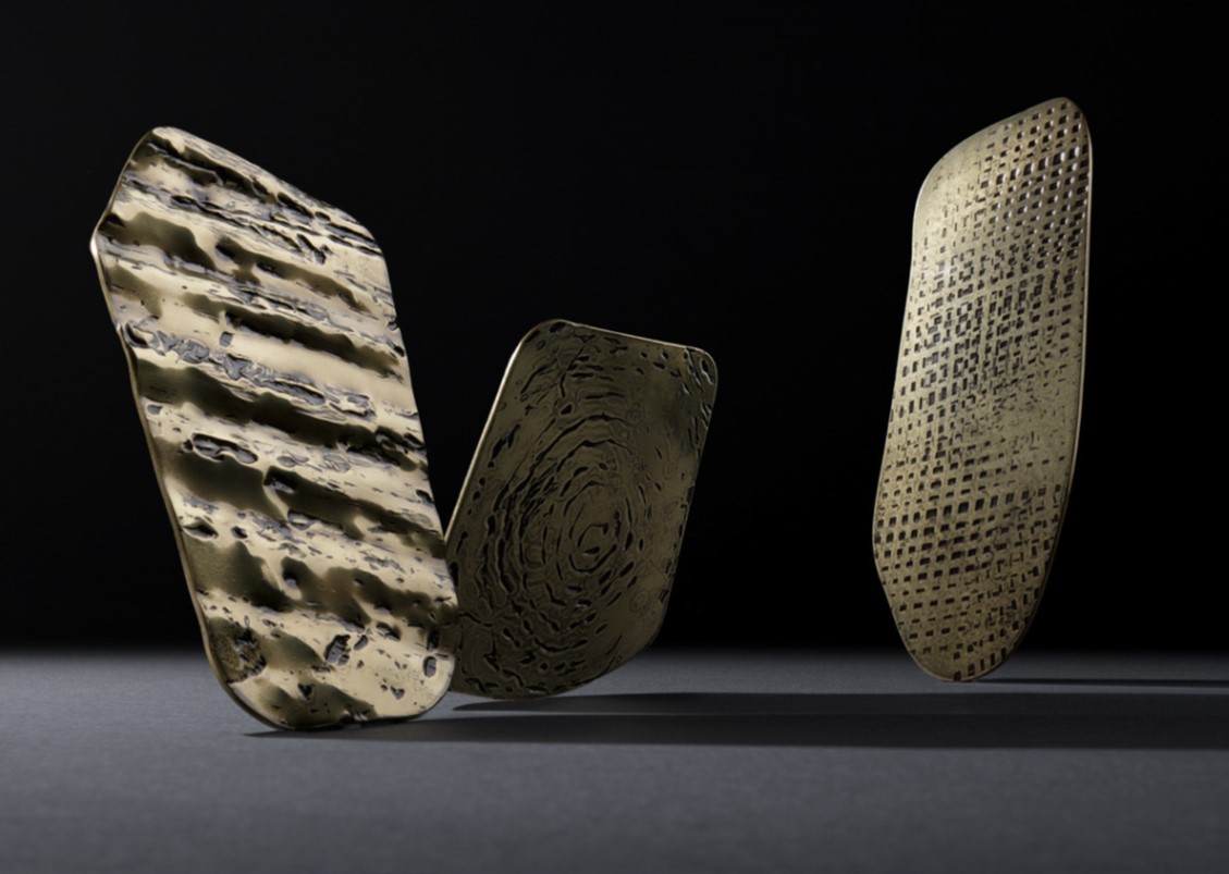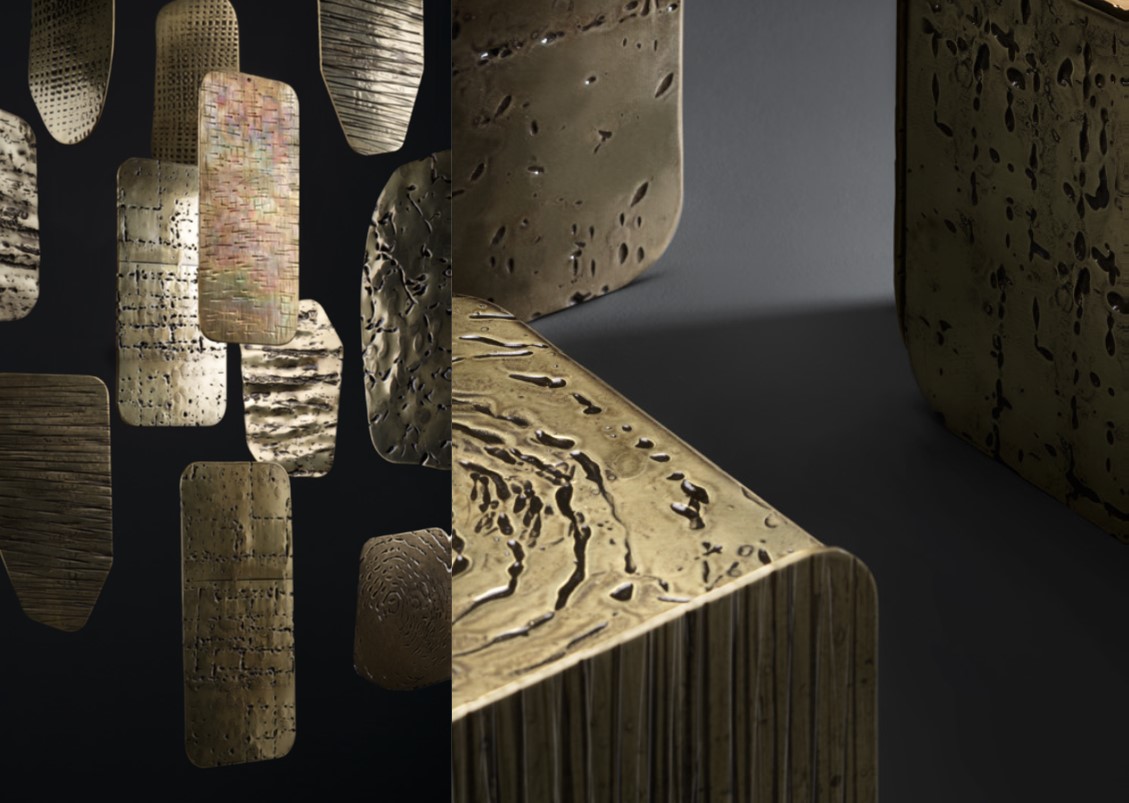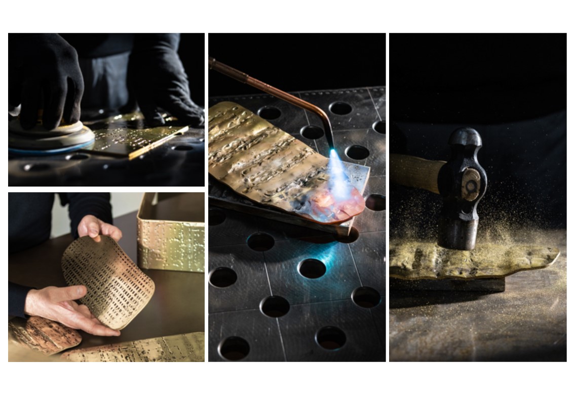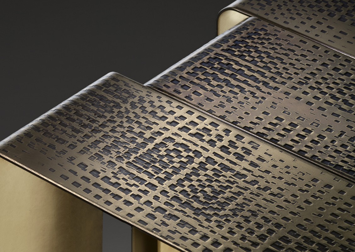 Inspired by the refined, sinuous aesthetics of Art Nouveau, the Xilo Coffee Table is a veritable sculpture in metal that exalts the hand-crafted techniques and manufacturing excellence of the company. Three sheets of thick brass, rounded at the ends and of different lengths, have been folded and abutted irregularly to create rhythmic movement. Each element features a distinct weave of imprints that dissolve in delicately fading marks, in contrast to the polished brass surface. The impressions on the surface of Xilo are the memory of manual manufacturing methods, evidence of the advanced artisanal capacity, and tireless research into the material.